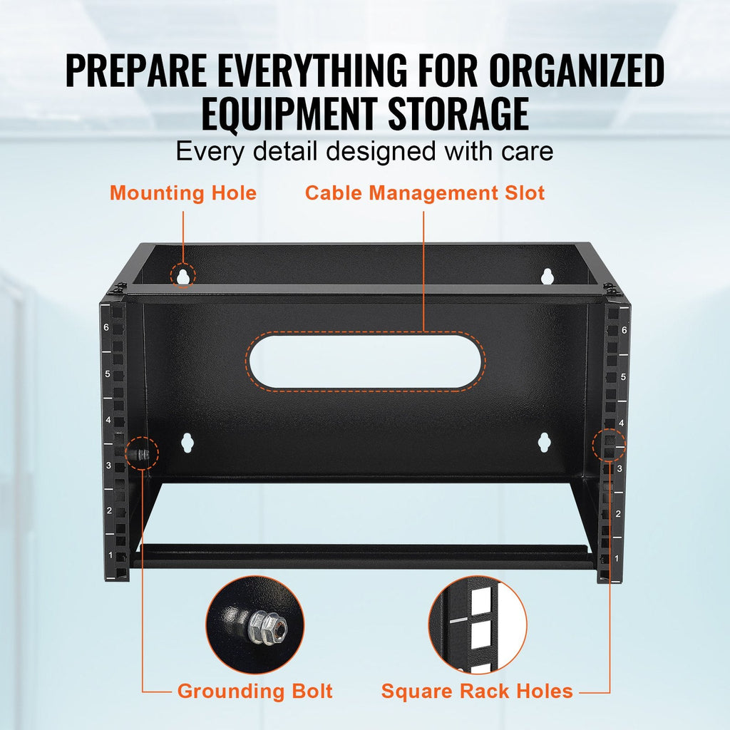 The VEVOR 6U Wall Mount Network Rack is the ideal solution for organizing and securing your networking and server equipment. With a depth of 14 inches and a standard 19-inch mounting width, this pre-assembled rack is ready for quick installation and supports up to 50 lbs of equipment. Constructed from durable Q235 steel, it offers excellent ventilation and added protection for servers, switches, patch panels, and AV gear in compact spaces.