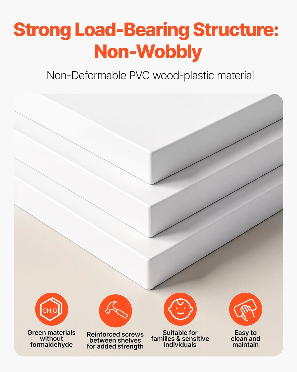 Sturdy & Durable: Made of PVC wood-plastic panels with reinforced shelves. Each tier supports up to 35 lbs, ensuring long-lasting stability.
