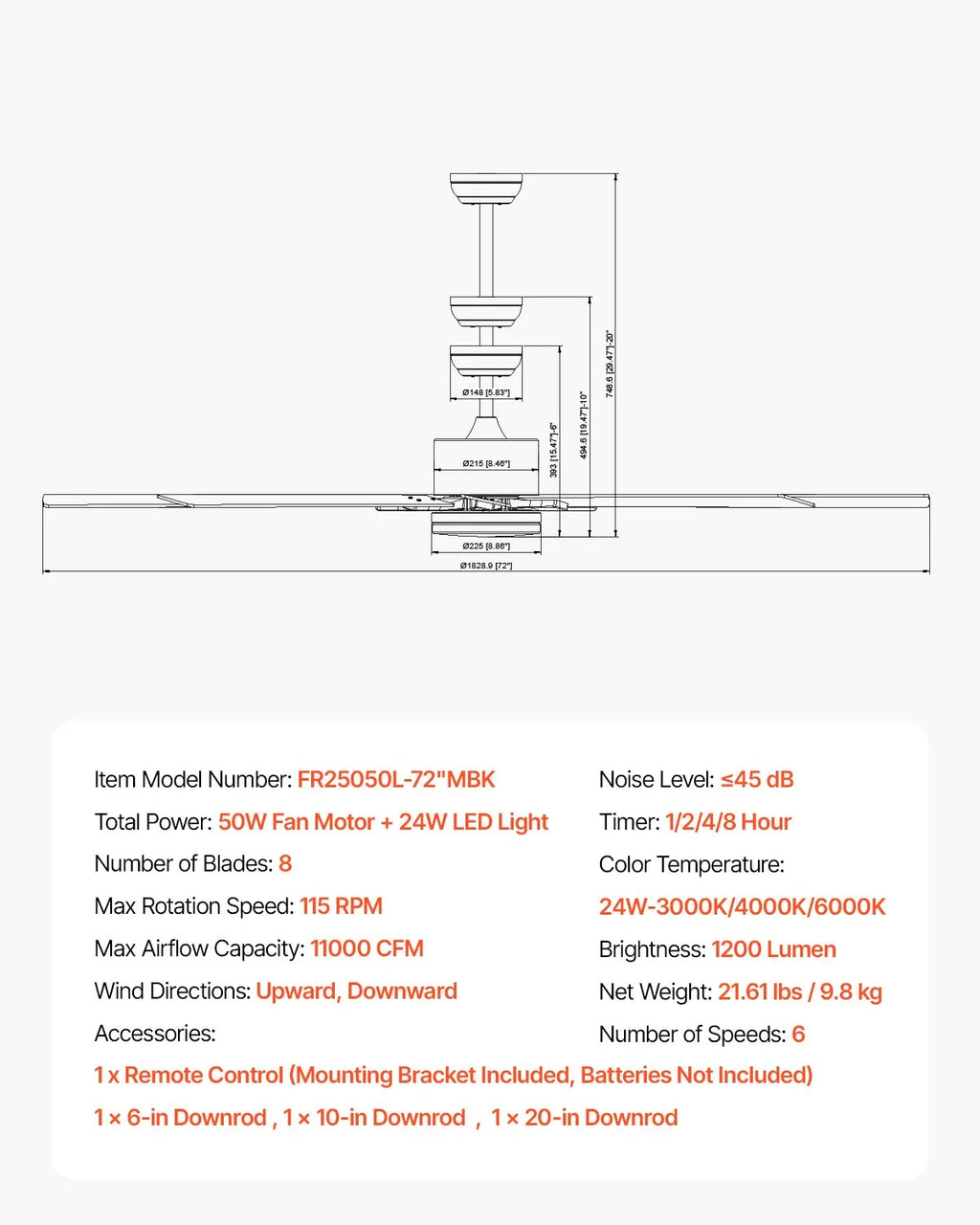 The VEVOR 72 Inch Ceiling Fan with Light combines powerful airflow, modern style, and energy-efficient performance. Featuring an 8-blade design and a reversible motor, this ceiling fan delivers strong air circulation for large rooms while maintaining quiet operation. With a 6-speed remote control and adjustable LED lighting, it provides year-round comfort and convenient control for homes, living rooms, patios, and commercial spaces.