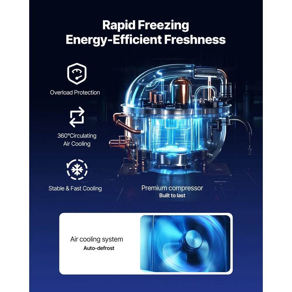 Quick Freezing: Equipped with an Embraco compressor and finned copper tubes for reliable, even cooling, maintaining freshness longer.