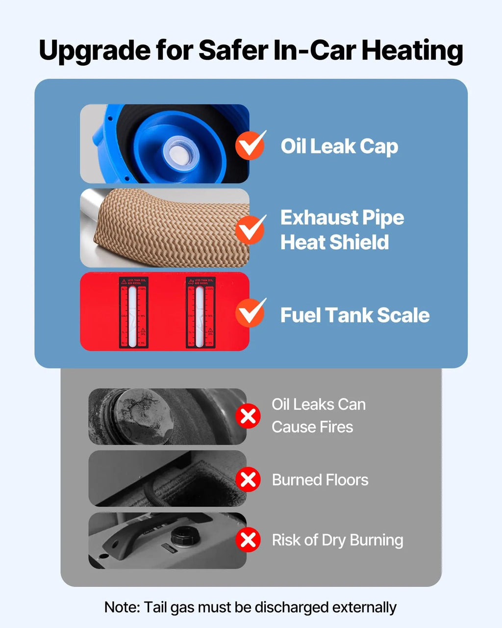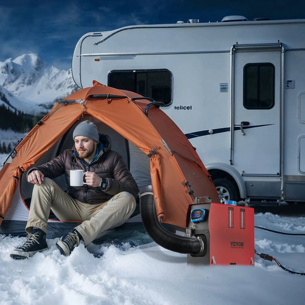 Equipped with a large 5L (1.3 gal) fuel tank and ≥90% combustion efficiency, this heater provides long-lasting warmth with minimal fuel consumption. Dual control options include a 98 ft remote for preheating from outside and an LCD screen for precise temperature adjustment from 32–104℉ / 0–40℃. Its compact design and safety features make it ideal for use in high-altitude or cold environments.