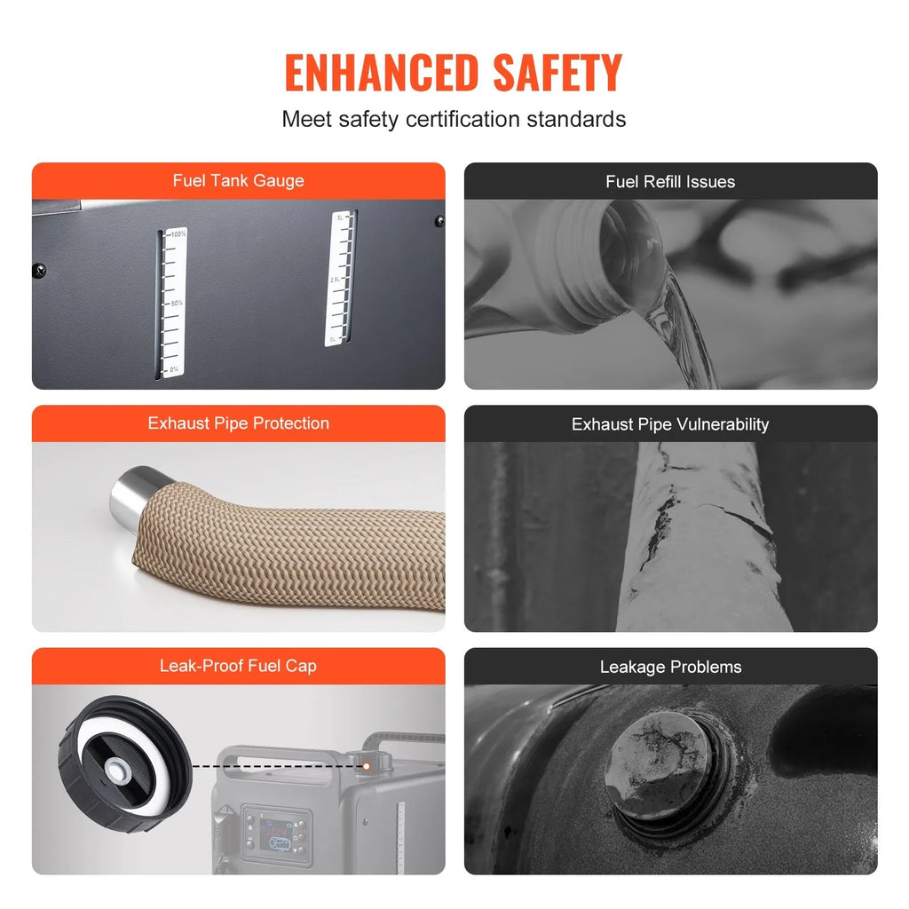 8KW Power with Low Fuel Consumption: Cast aluminum body and ceramic igniter ensure rapid heating. Fuel consumption is only 0.18-0.35L/h with ≥90% combustion efficiency.