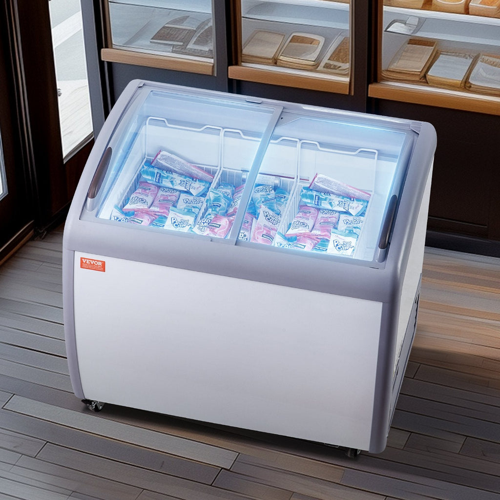 Showcase your frozen treats in style with the VEVOR 9.3 Cu.ft Commercial Ice Cream Display Case. Designed for gelato, ice cream, and other frozen desserts, this dipping freezer offers a spacious 264-liter interior, smart temperature control, and high-efficiency direct cooling. Its sleek coated steel construction, clear viewing window, and smooth-rolling casters make it perfect for convenience stores, cafes, and dessert parlors. Whether you’re serving customers or storing frozen goods, this freezer ensures reliable performance and an eye-catching display.