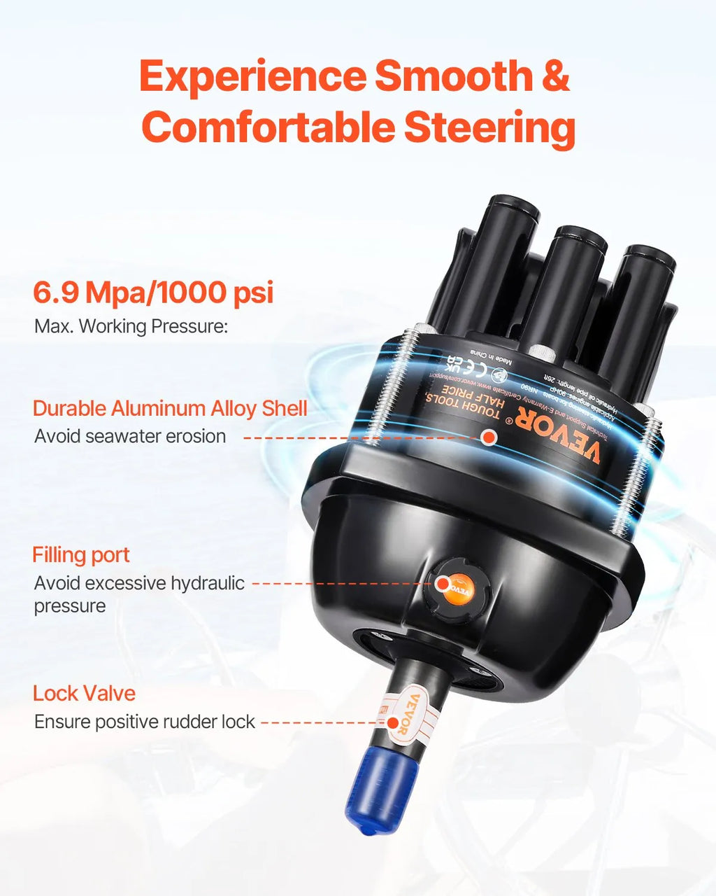 6.9 MPa / 1000 psi hydraulic helm for smooth and responsive steering