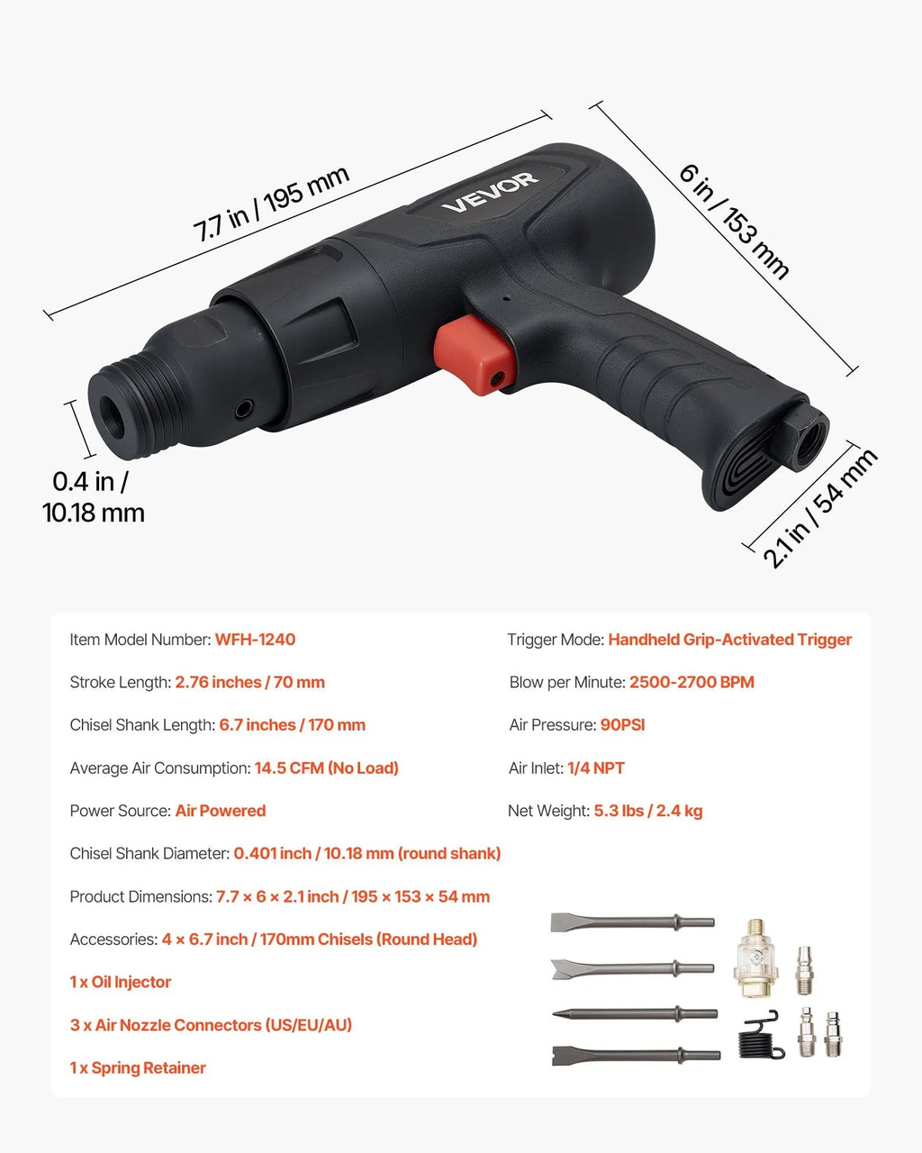 Make your heavy-duty cutting, chiseling, and demolition tasks faster and more efficient with the VEVOR Air Hammer, a compact yet powerful pneumatic tool engineered for metalworking, construction, automotive repair, and general demolition work. Delivering an impressive 2500–2700 BPM and a 2.76-inch long stroke, this air chisel ensures strong impact force while minimizing operator fatigue. Equipped with a pistol-grip ergonomic handle, durable aluminum alloy housing, and a full set of long-barrel chisels, it gives you the precision, performance, and reliability needed for demanding jobs.