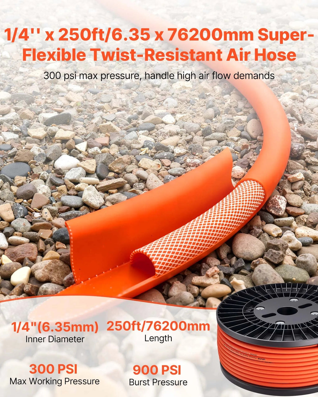 Ensure reliable airflow for your pneumatic tools with the VEVOR Air Hose. Measuring 1/4" × 250 ft, this lightweight, hybrid hose combines strength, flexibility, and all-weather durability for professional and DIY use. Ideal for auto, home, and industrial applications, it handles high pressures while resisting kinks, cracks, and hardening in any environment.