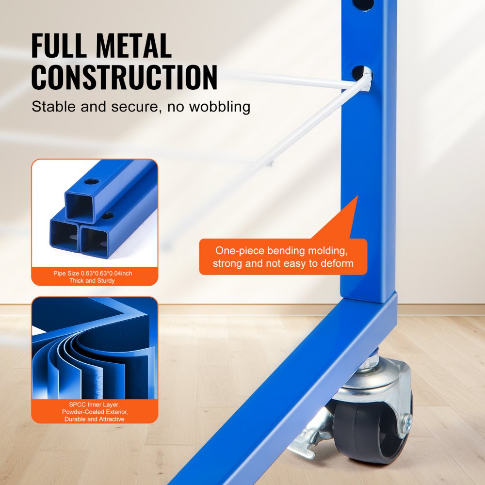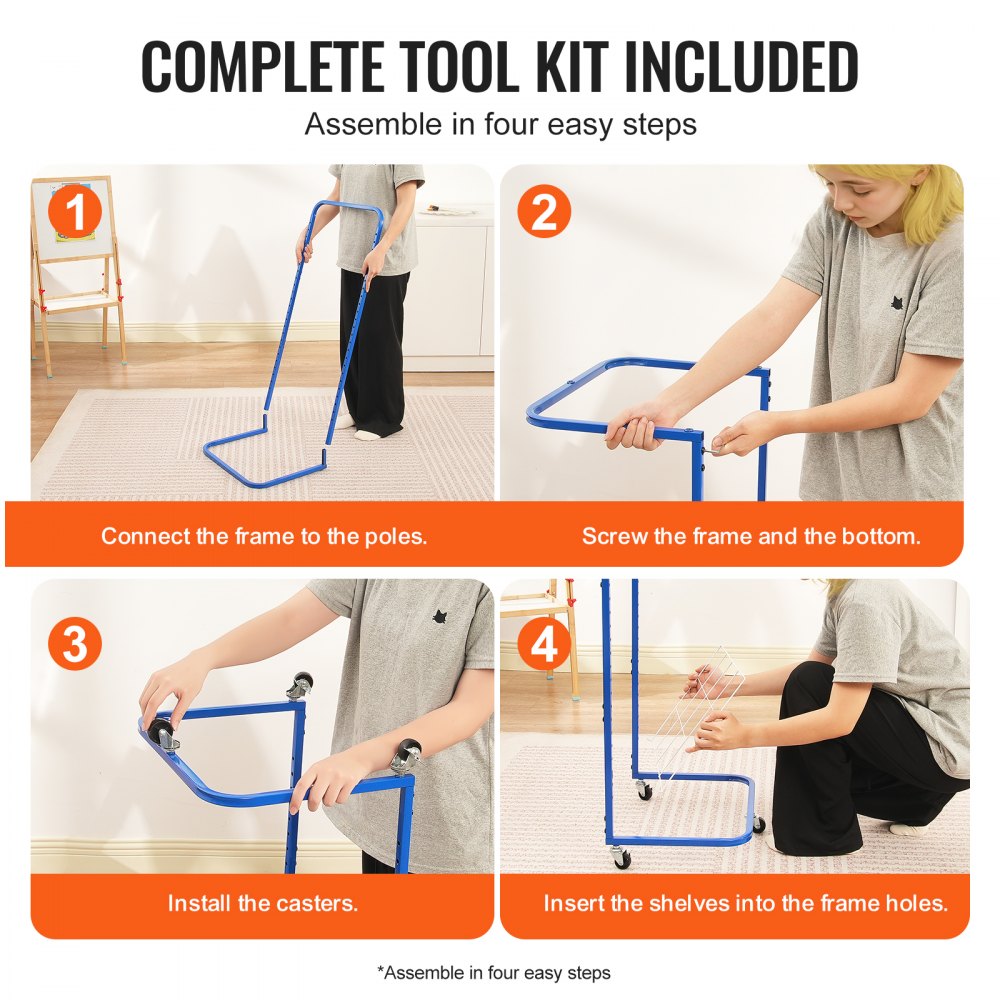 Organize and dry your artwork efficiently with the VEVOR Art Drying Rack, featuring 25 removable shelves and a mobile design for classroom, studio, or home use. Built from sturdy carbon steel and finished in blue and white, this rack supports multiple canvases or paper pieces with ease. With a high weight capacity, smooth-rolling casters, and tool-free assembly, it's a versatile and durable solution for drying paintings, prints, or crafts.