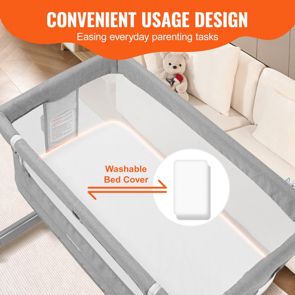 Provide your newborn with a cozy and safe sleeping space with the VEVOR Baby Bassinet. This bedside sleeper features 5-level height adjustment, allowing you to perfectly align it with your bed for easy nighttime care. Equipped with smooth-rolling wheels, the bassinet glides effortlessly around the room for convenience. Designed for comfort and breathability, it includes a soft mattress and a breathable mosquito net for a peaceful sleep environment. The side-opening design makes diaper changes and soothing your baby simple and stress-free. Its washable bed cover adds to the practical and hygienic design that busy parents appreciate.