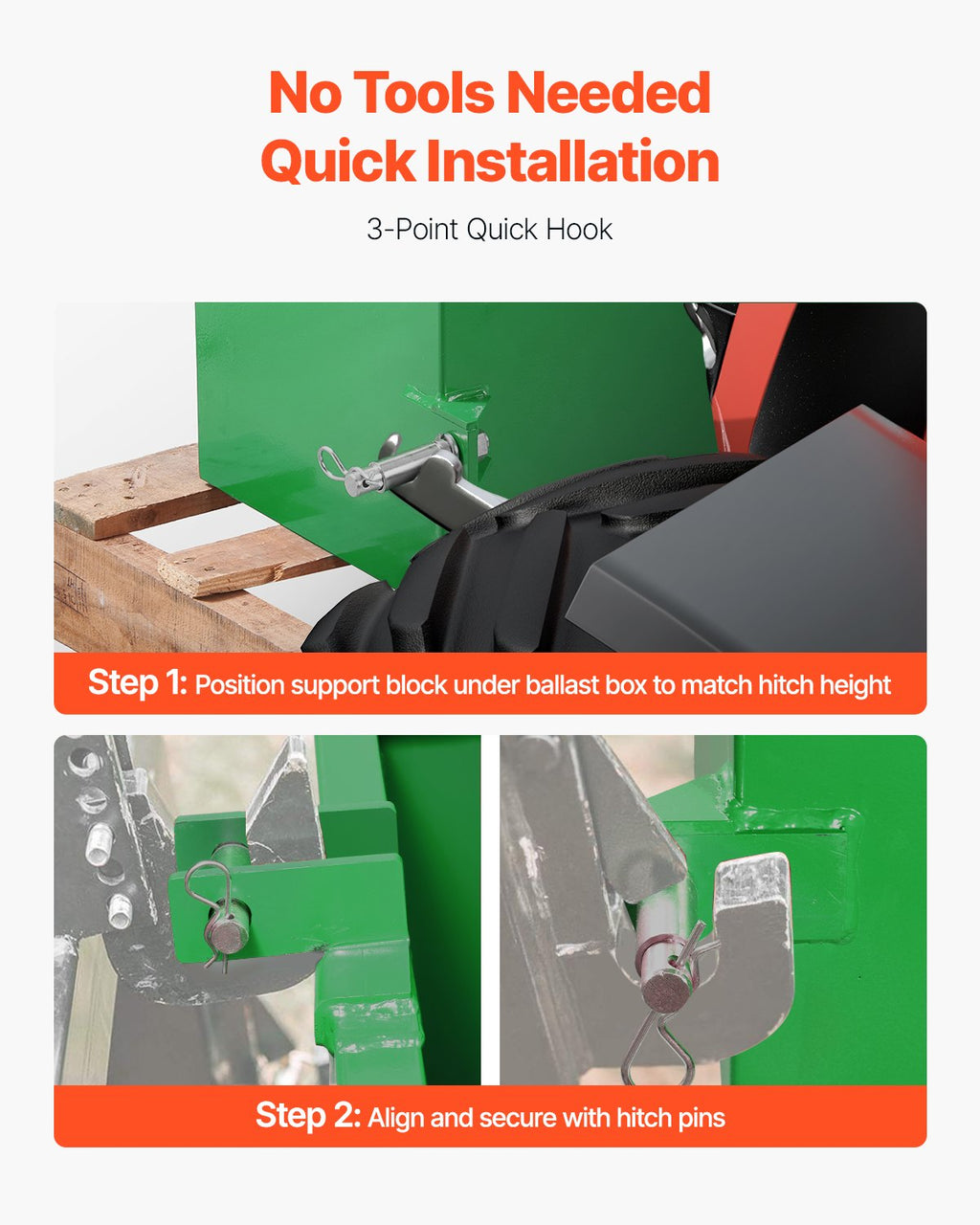 The VEVOR Ballast Box is the perfect solution for enhancing your tractor’s traction and stability during heavy-duty tasks. Designed for easy attachment with a Category 1 3-point hitch, this counterweight offers a load capacity of up to 800 lbs, making it ideal for use with tractors requiring additional weight for improved performance. Made from heavy-duty steel and equipped with a sliding door for convenient access, this ballast box is built for durability and efficiency. Its thoughtful design ensures it’s easy to install and use, providing enhanced control and safety during your farming, landscaping, or construction work.