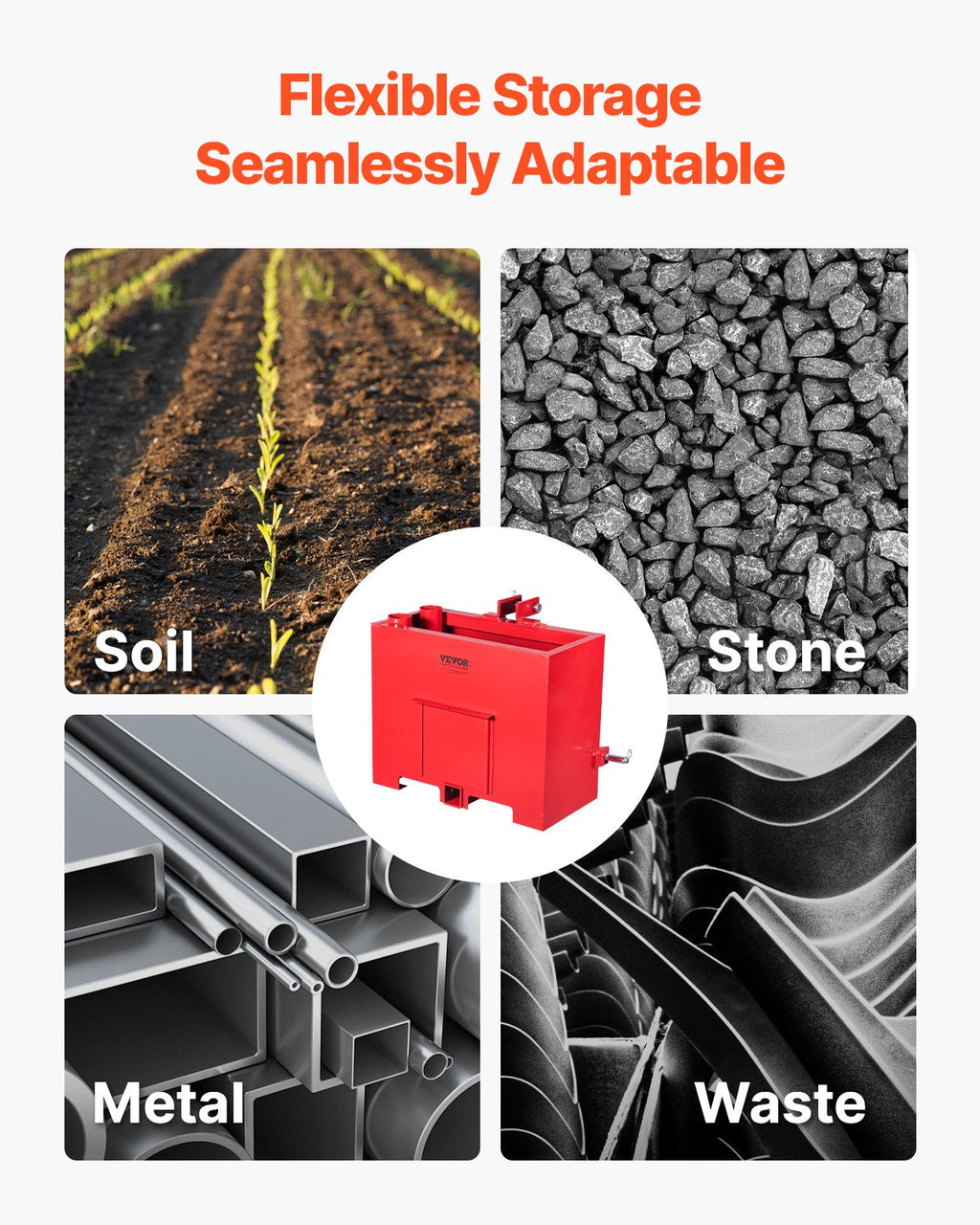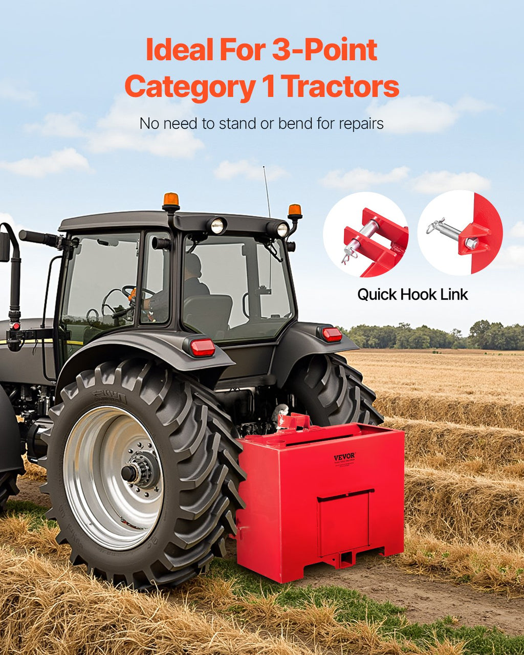 The VEVOR Ballast Box 3 Point Category 1 Tractor Quick Tach Hitch Counterweight is a durable and efficient solution to enhance the traction and stability of your tractor. Made from heavy-duty steel and featuring professional craftsmanship, this counterweight offers up to 800 lbs of load capacity, making it perfect for balancing your tractor when handling heavy loads. Its red color provides high visibility, and the quick tach hitch design ensures easy attachment. This ballast box is designed for maximum performance, offering enhanced safety and functionality for a wide range of tasks, from smelting and welding to cutting.