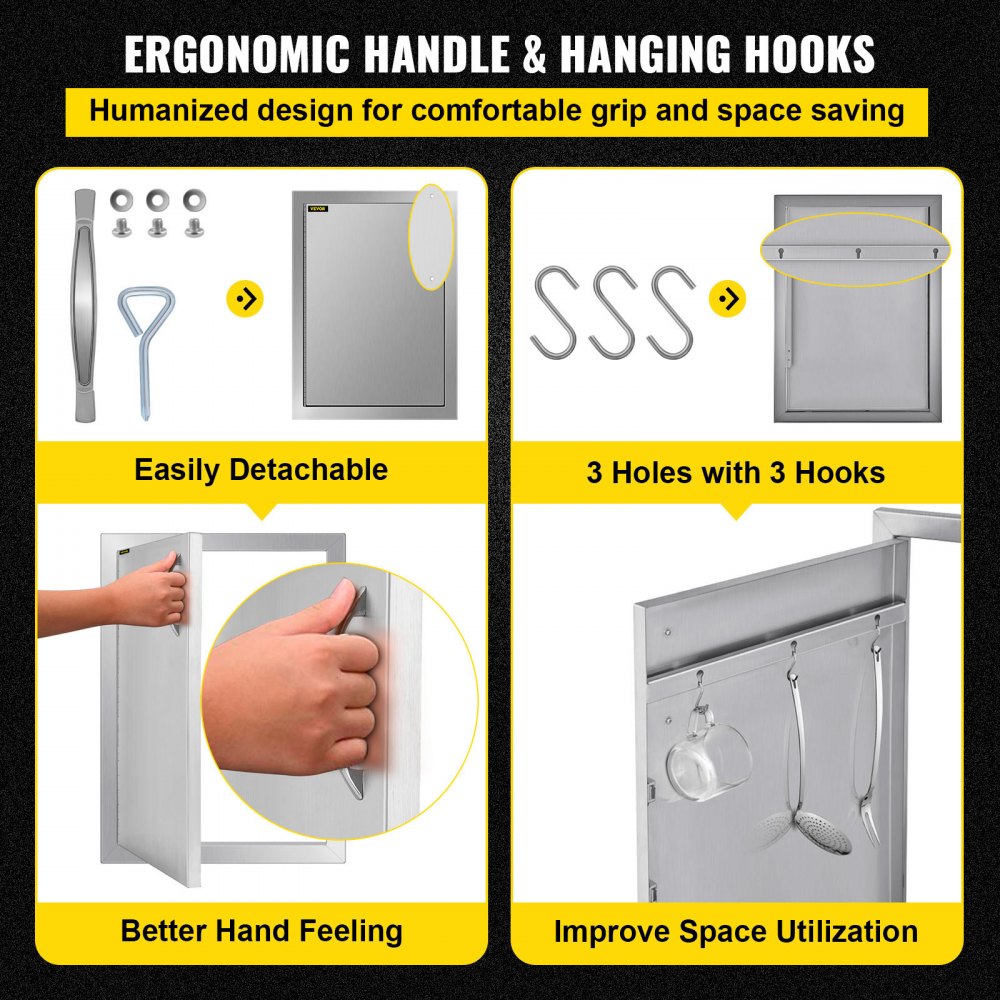Enhance your outdoor kitchen setup with the VEVOR BBQ Access Door—a sleek and functional addition designed to combine style, convenience, and durability. Measuring 16 x 22 inches, this vertical, left-hinged access door is crafted from premium stainless steel, providing excellent resistance to weather, rust, and corrosion. Whether you’re upgrading your BBQ island or building a new outdoor cooking area, this door offers smooth access to internal storage while complementing your kitchen with a polished, modern look. It's an ideal solution for keeping grilling tools, propane tanks, or cleaning supplies neatly organized and protected.