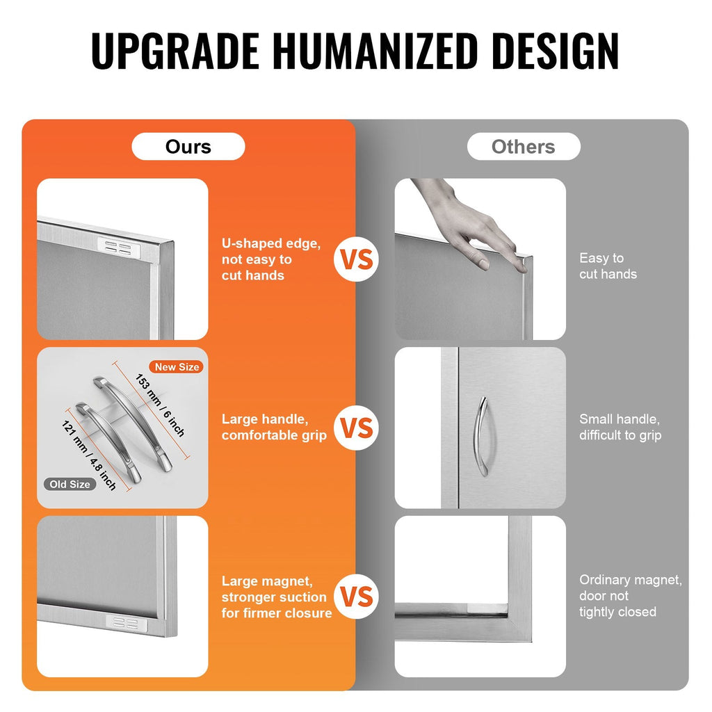 Upgrade your outdoor kitchen with the VEVOR BBQ Access Door. This 17" x 24" stainless steel flush mount door is designed for durability and convenience. Perfect for BBQ islands, grilling stations, or outdoor cabinets, it features a sleek, modern design with a recessed handle for easy operation. With premium materials and precise dimensions, this access door ensures reliable performance and a seamless installation experience.