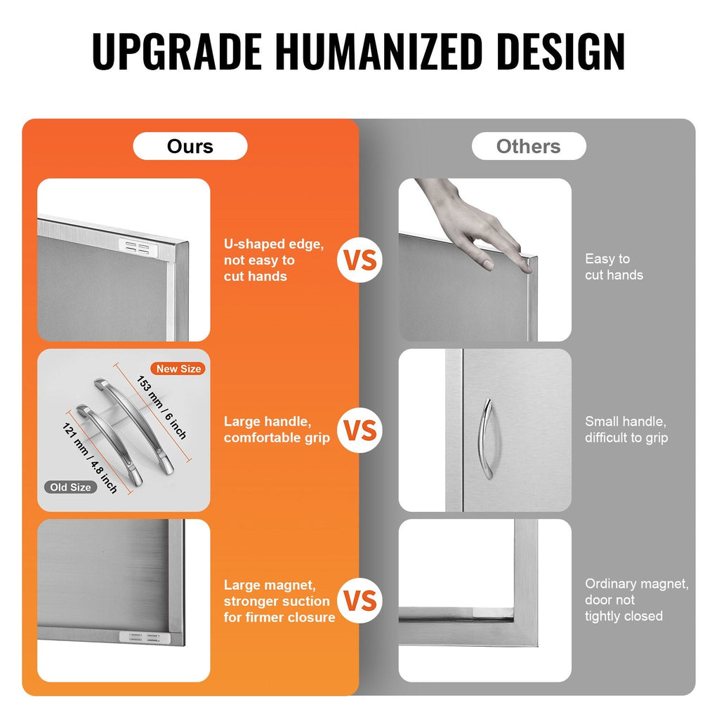 The VEVOR BBQ Access Door is a durable and sleek single-door solution for your outdoor kitchen or grilling station. Measuring 27" x 20", this stainless steel flush mount door is designed with a sturdy handle for easy access and functionality. Its premium construction ensures long-lasting use and easy maintenance, making it a perfect addition to BBQ islands, outdoor cabinets, or grilling stations. The simple and quick installation process adds to its appeal for DIY outdoor kitchen enthusiasts.