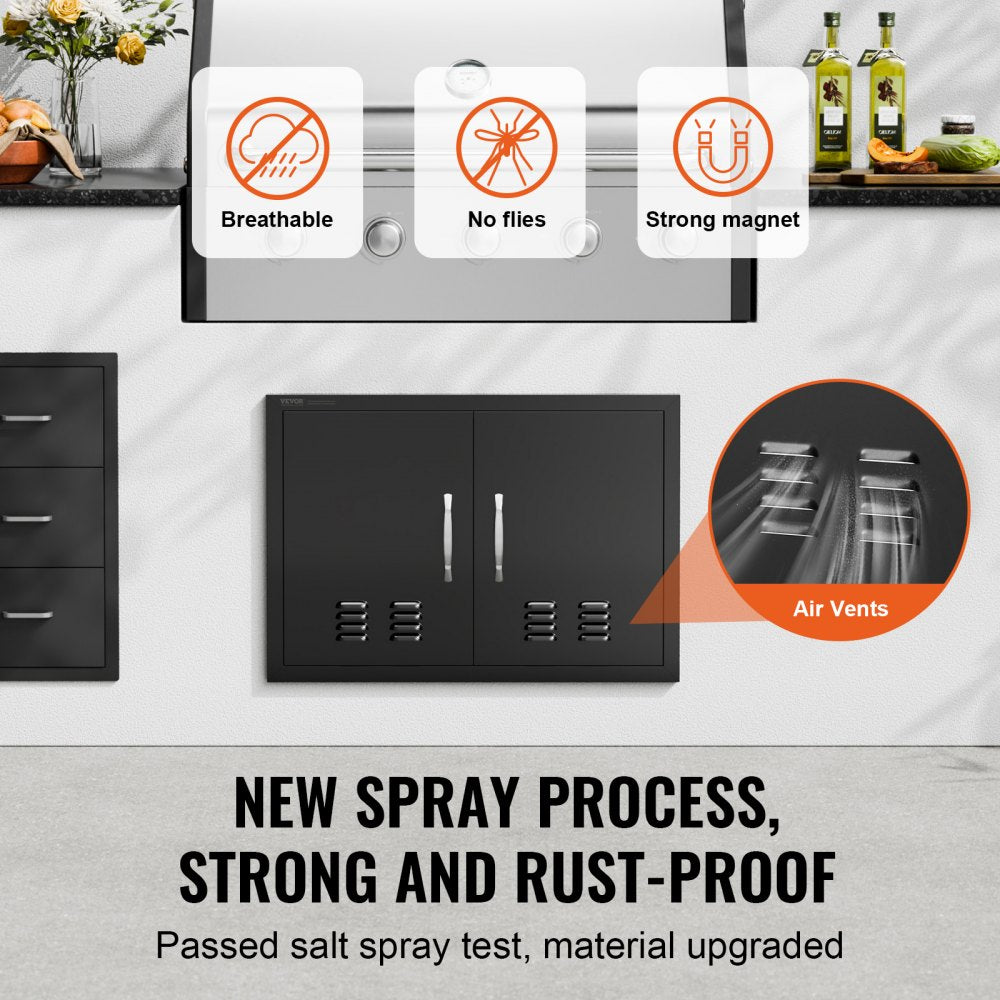 Upgrade your outdoor kitchen setup with the VEVOR BBQ Access Door. Measuring 30 x 21 inches, this double-door unit features a flush mount design with convenient handles and ventilation slots, making it a practical and stylish solution for BBQ islands and grilling stations. Made from durable cold plate steel with a powder-coated matte black finish, it offers long-lasting performance and a modern aesthetic. Easy to install and versatile enough for various outdoor cabinetry needs.