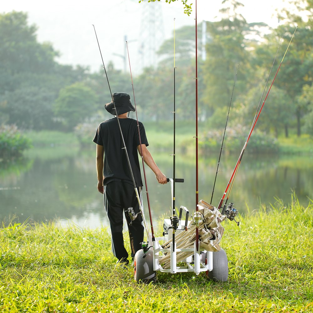 Take your fishing experience to the next level with the VEVOR Beach Fishing Cart, built for rugged terrain and heavy-duty loads. With a 300 lb load capacity and two oversized 13-inch PU balloon tires, this cart effortlessly glides over sand and uneven surfaces. The durable aluminum frame supports up to eight fishing rods, while its spacious cargo bed holds everything from coolers to tackle boxes. Designed with a non-slip handle and anti-loose bolts, this cart ensures stability, easy maneuverability, and secure transport. Ideal for fishing, picnics, or beach trips.
