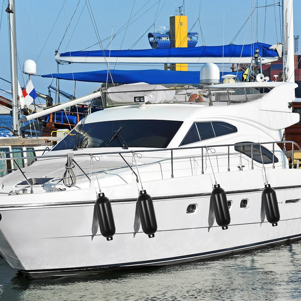 Protect your vessel from impacts and abrasion with the VEVOR Boat Fender Set. This pack includes four 8.5" x 27" marine-grade fenders in a sleek black finish, designed to safeguard your boat’s sides during docking or mooring. Each fender features a durable ribbed surface for extra strength and twin eyelets for flexible horizontal or vertical installation. Made from high-quality PVC for enhanced durability, these boat bumpers come with a convenient pump for easy inflation. Ideal for boats of various sizes, they offer optimal protection and peace of mind on the water.