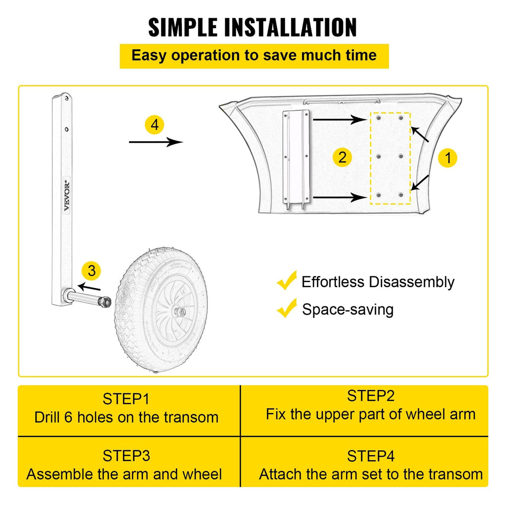 Simplify your boat launching process with the VEVOR 15" Boat Transom Launching Wheels, engineered to support up to 300 lbs of weight. Featuring large 15-inch rubber wheels, these transom-mounted dolly wheels ensure smooth transport over sand, gravel, and uneven surfaces. The solid aluminum alloy frame arms offer excellent durability and corrosion resistance, while the included quick-release spring lock pins allow for fast and easy attachment or removal. Ideal for inflatable boats, kayaks, dinghies, and other small vessels, these launching wheels provide reliable performance across various launching environments.