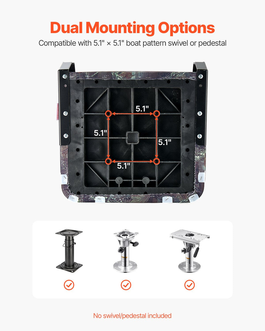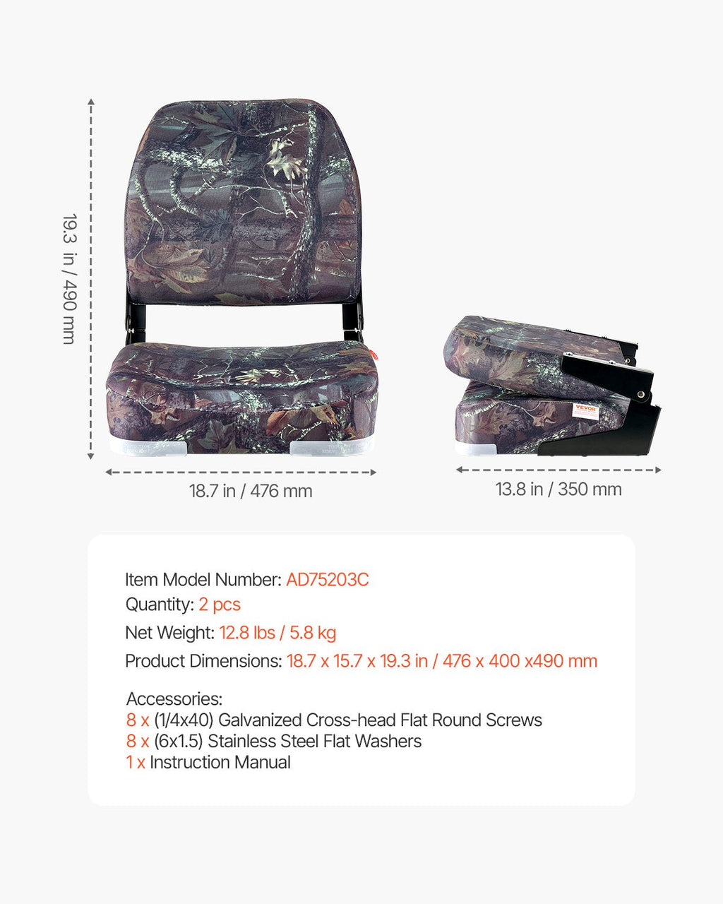 The VEVOR Low Backrest Boat Seats are built to endure the rigors of marine environments while offering dependable comfort and support. Featuring a flip-up design for space-saving convenience and thick sponge cushioning for long-lasting comfort, these seats are ideal for all types of boats. Their camouflage finish blends durability with rugged style, making them a smart upgrade for any watercraft.
