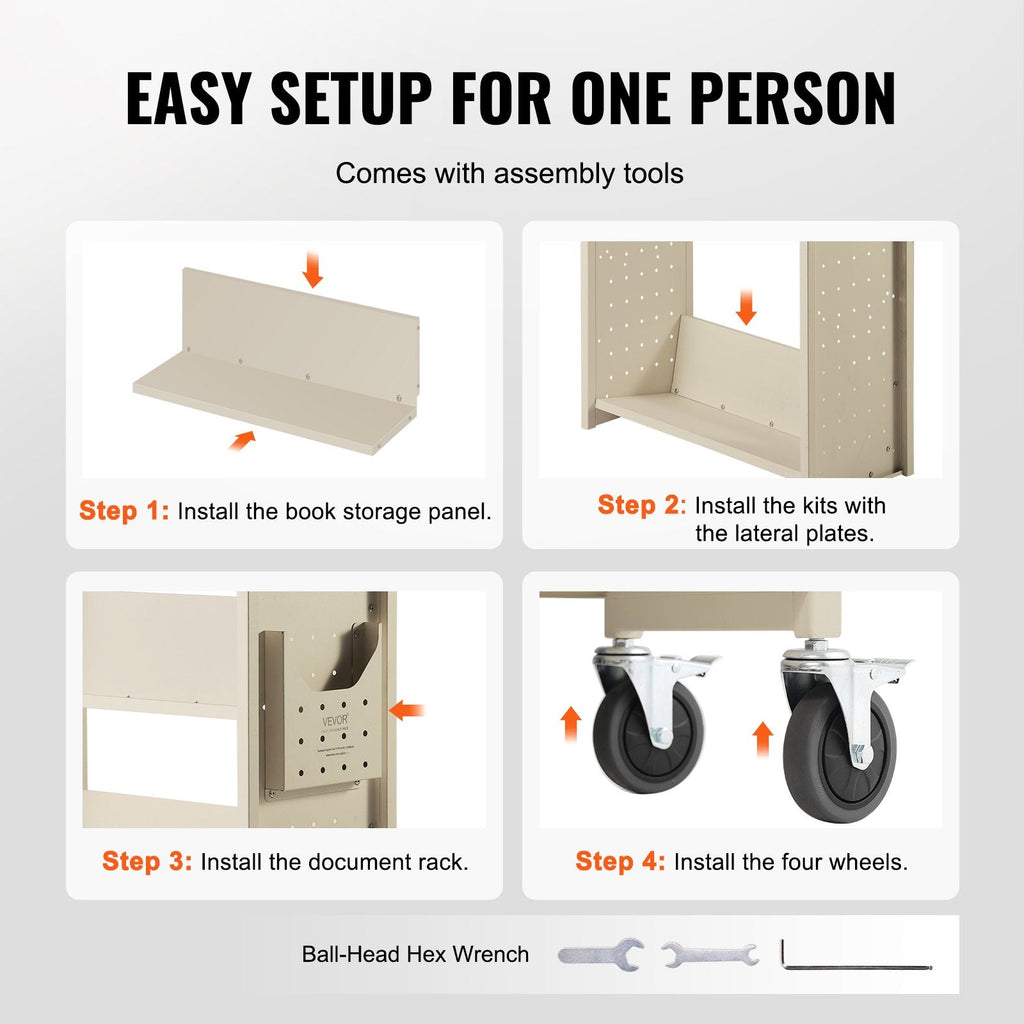 The VEVOR Book Cart is the perfect storage solution for libraries, offices, schools, or homes. With a robust 330 lbs total load capacity and a single-sided, V-shaped sloped design, this rolling cart allows for efficient storage and easy access to books and materials. Built with durable carbon steel and smooth, lockable wheels, this cart ensures both mobility and stability. The powder-coated finish and versatile design make it a stylish yet practical addition to any environment.