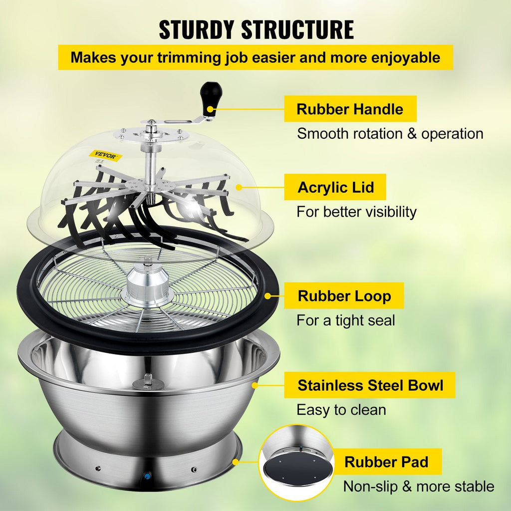 Streamline your trimming process with the VEVOR 24-Inch Bowl Trimmer, a powerful and versatile tool designed for both electric and manual operation. Ideal for trimming plant buds, leaves, and flowers, this 2-in-1 trimmer features upgraded gears and a visible plastic cover that allows you to monitor the cutting process in real time. The high-efficiency stainless steel blades and included rubber scissors and hand pruner ensure clean, precise cuts with minimal effort. With a large 24-inch diameter bowl, it’s perfect for processing high volumes, making it suitable for both commercial growers and hobbyists. Its durable stainless steel construction, ease of use, and dual functionality make it an essential tool for any hydroponic or home gardening setup.