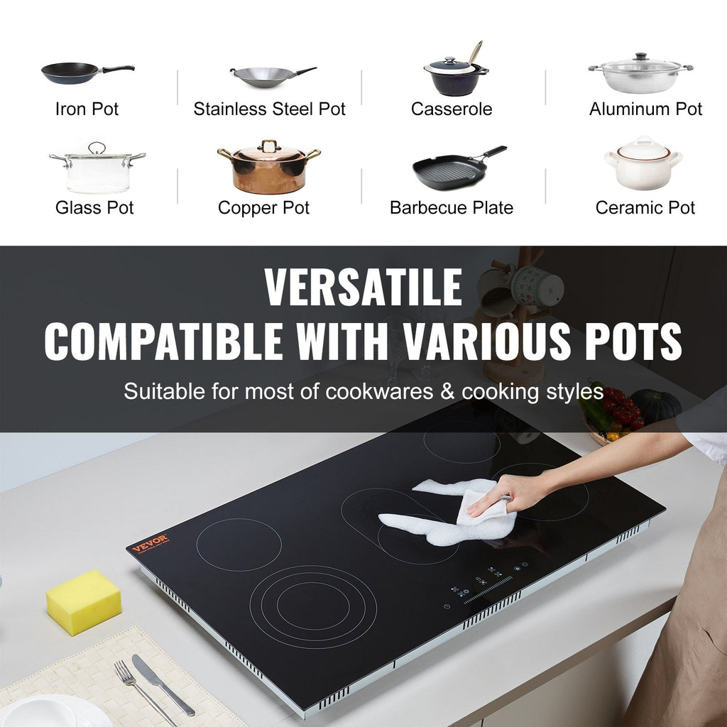 The VEVOR Built-in Electric Cooktop features a sleek radiant ceramic surface with 5 powerful burners, perfect for preparing multiple dishes simultaneously. Designed for modern kitchens, it boasts a 9-level touch slider control panel for precision cooking and supports a wide range of cookware. With built-in installation, easy maintenance, and 5 major safety protections, this 8600W cooktop ensures both performance and peace of mind in any home kitchen.