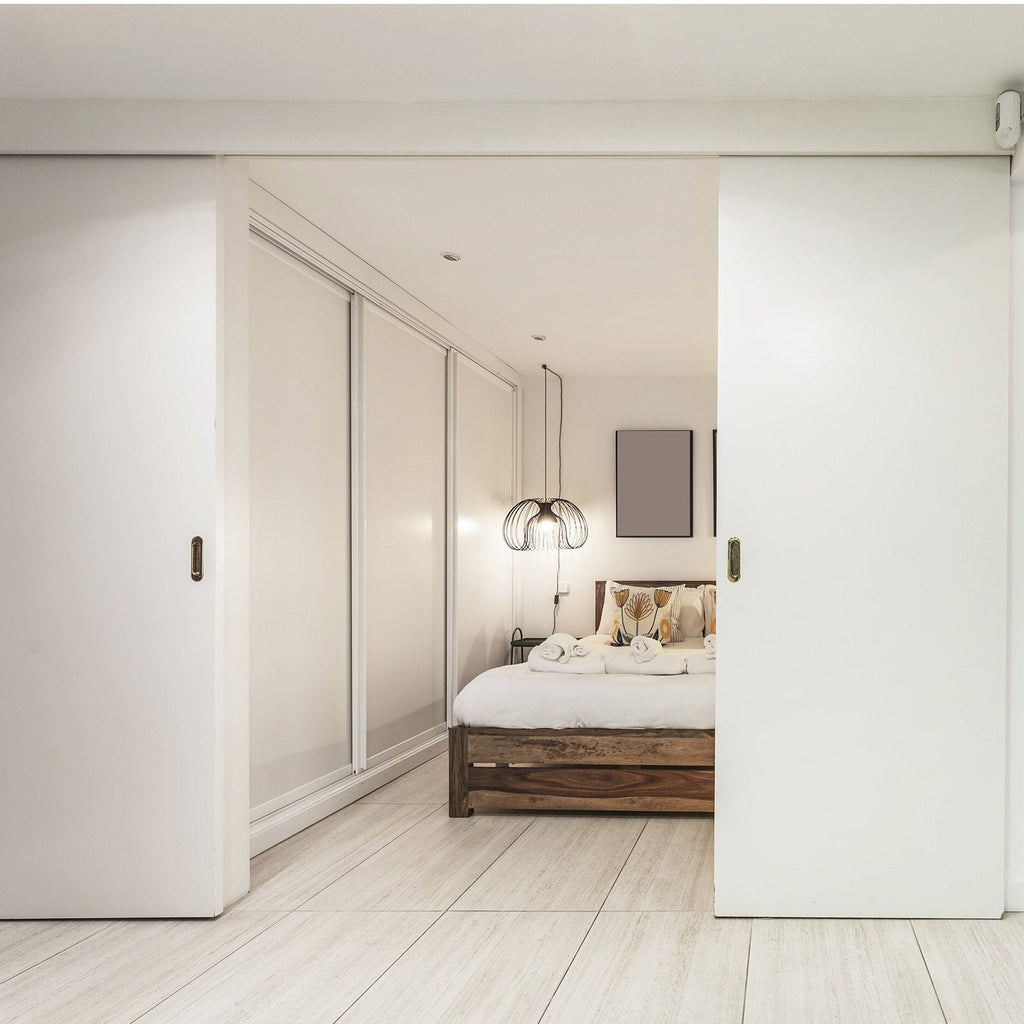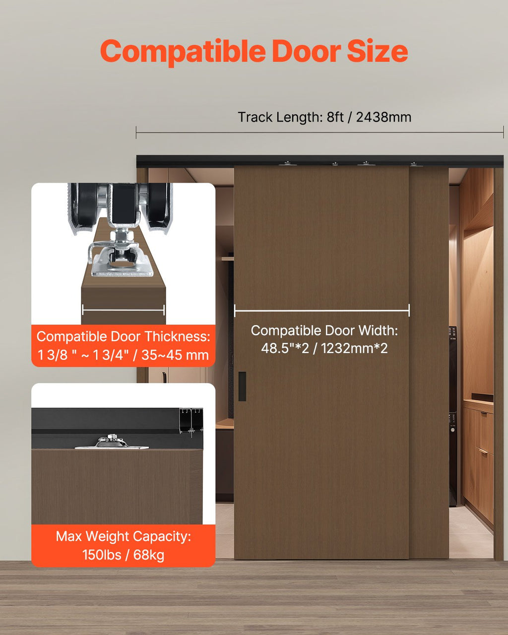 Upgrade your closet or interior space with the VEVOR 8ft Bypass Sliding Door Hardware Kit. Designed for two-door systems, this durable aluminum alloy track provides smooth and stable sliding performance. It supports doors up to 150 lbs and fits most standard door thicknesses, making it a perfect solution for modernizing storage areas with style and function.