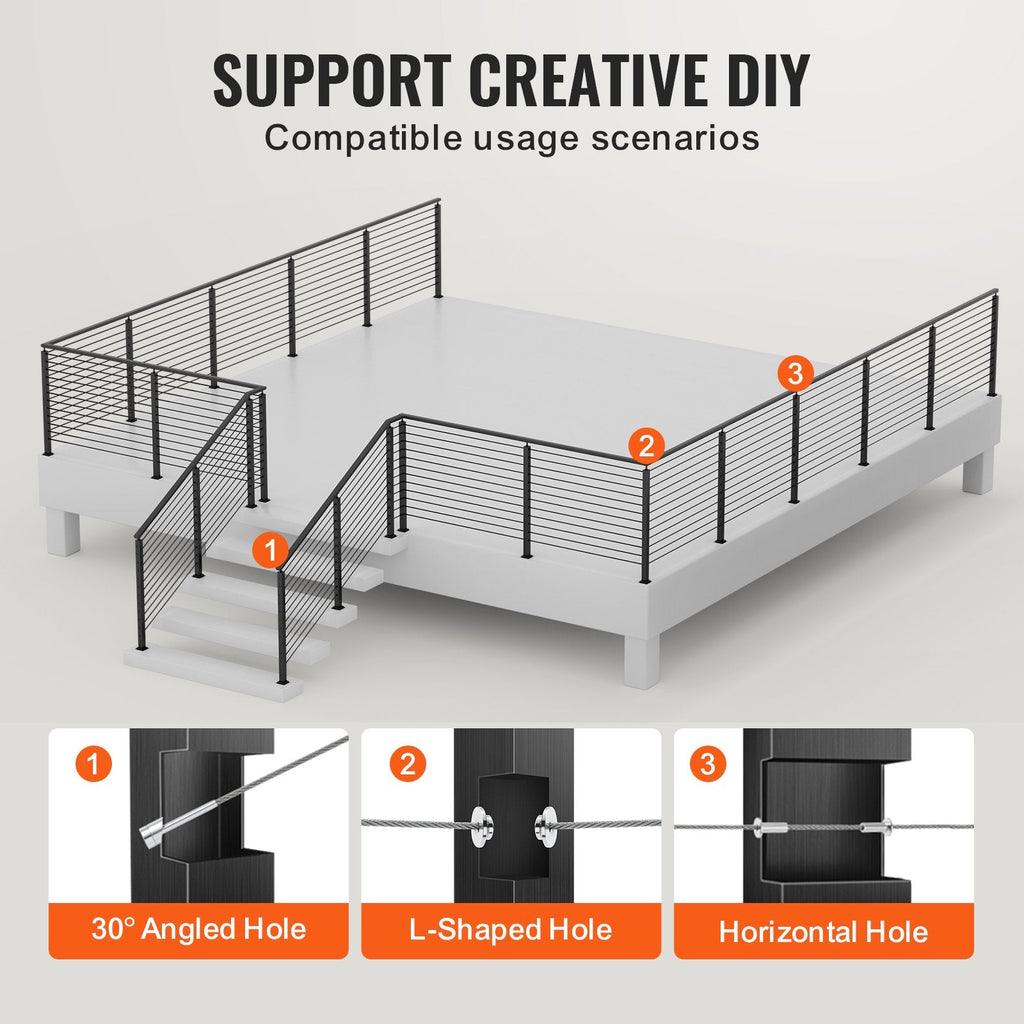 The VEVOR Cable Railing Post offers a durable and stylish solution for your deck or balcony railing system. Made of SUS304 stainless steel, this 36" x 2" x 2" post features 10 pre-drilled horizontal holes, making it ideal for cable railing installations. The post includes both flat and curved brackets for flexible mounting, ensuring compatibility with various deck designs. With a sleek black finish and compliance with building spacing standards, this cable railing post provides both functionality and aesthetic appeal for outdoor spaces. Perfect for DIY enthusiasts or professional installers alike.