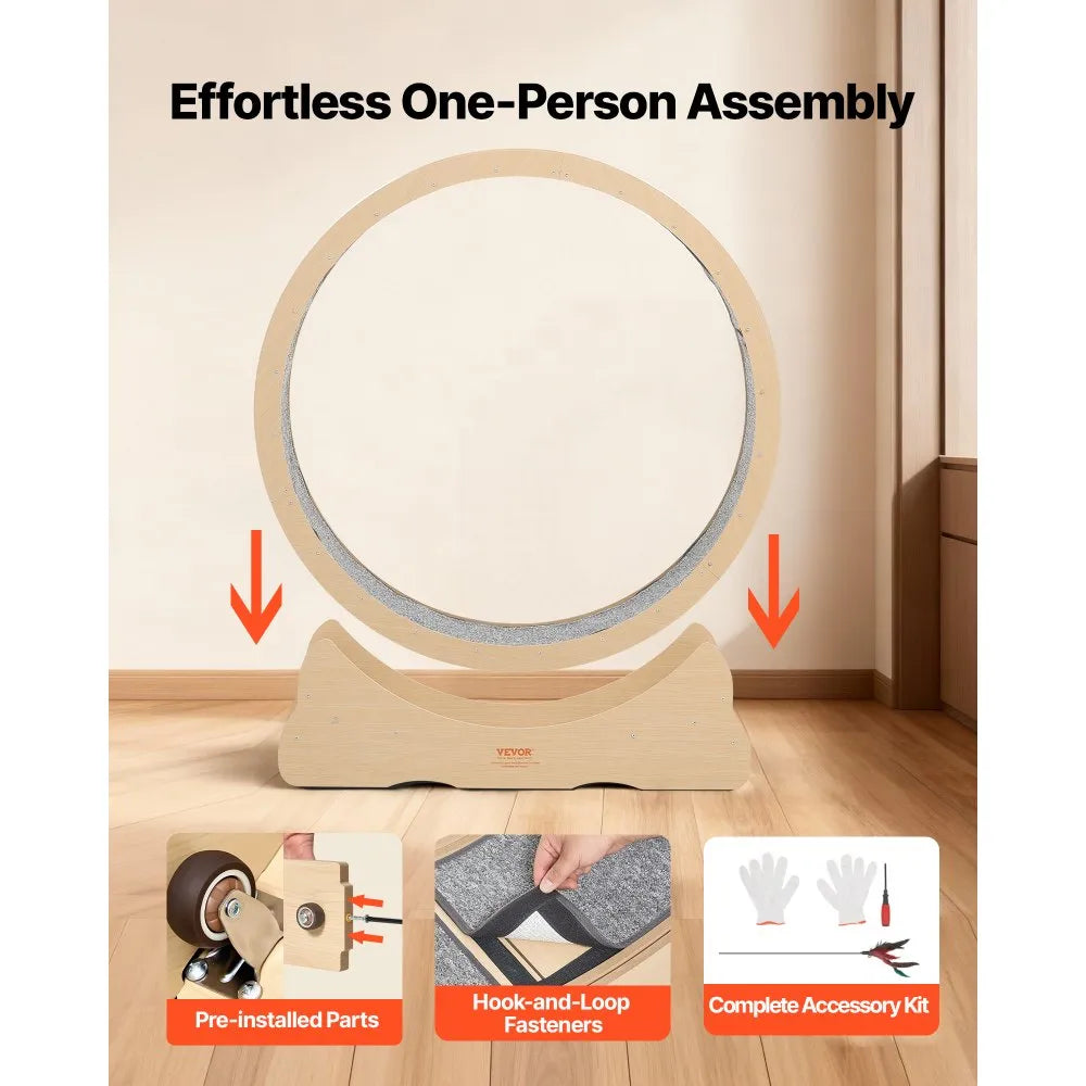Keep your cat active, healthy, and entertained with the VEVOR Cat Exercise Wheel, a spacious wooden running wheel designed for indoor cats up to 28 lbs. Featuring a carpeted runway, silent operation, and a secure locking mechanism, this treadmill-style wheel encourages daily exercise, reduces stress, and promotes overall feline fitness. Its durable construction and complete accessory kit make it ideal for medium to large cats in any home.