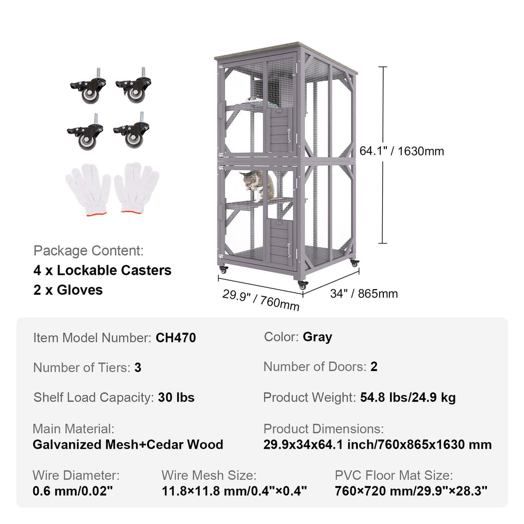 Give your feline friends a safe, spacious outdoor playground with the VEVOR 3-Tier Cat House Catio. Crafted with sturdy galvanized wire mesh and natural fir wood platforms, this enclosure offers a secure and comfortable environment for your cats to explore and relax. Equipped with a large front door for easy access, two platforms, a cozy resting box, and smooth 360° rotating casters, it’s easy to move and assemble. Perfect for multiple cats or other small pets, this versatile catio ensures your pets enjoy fresh air while staying protected.