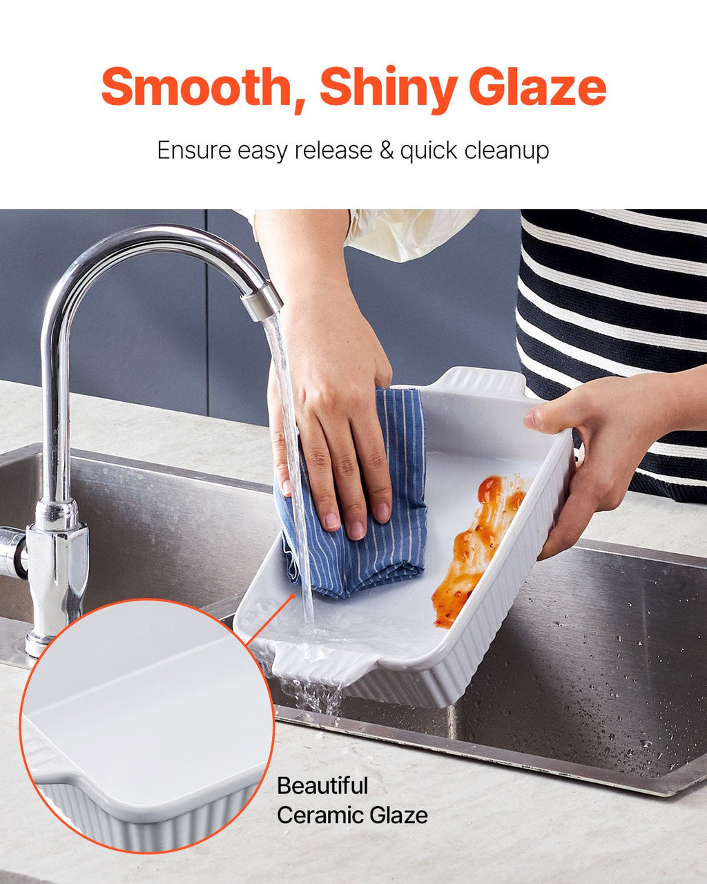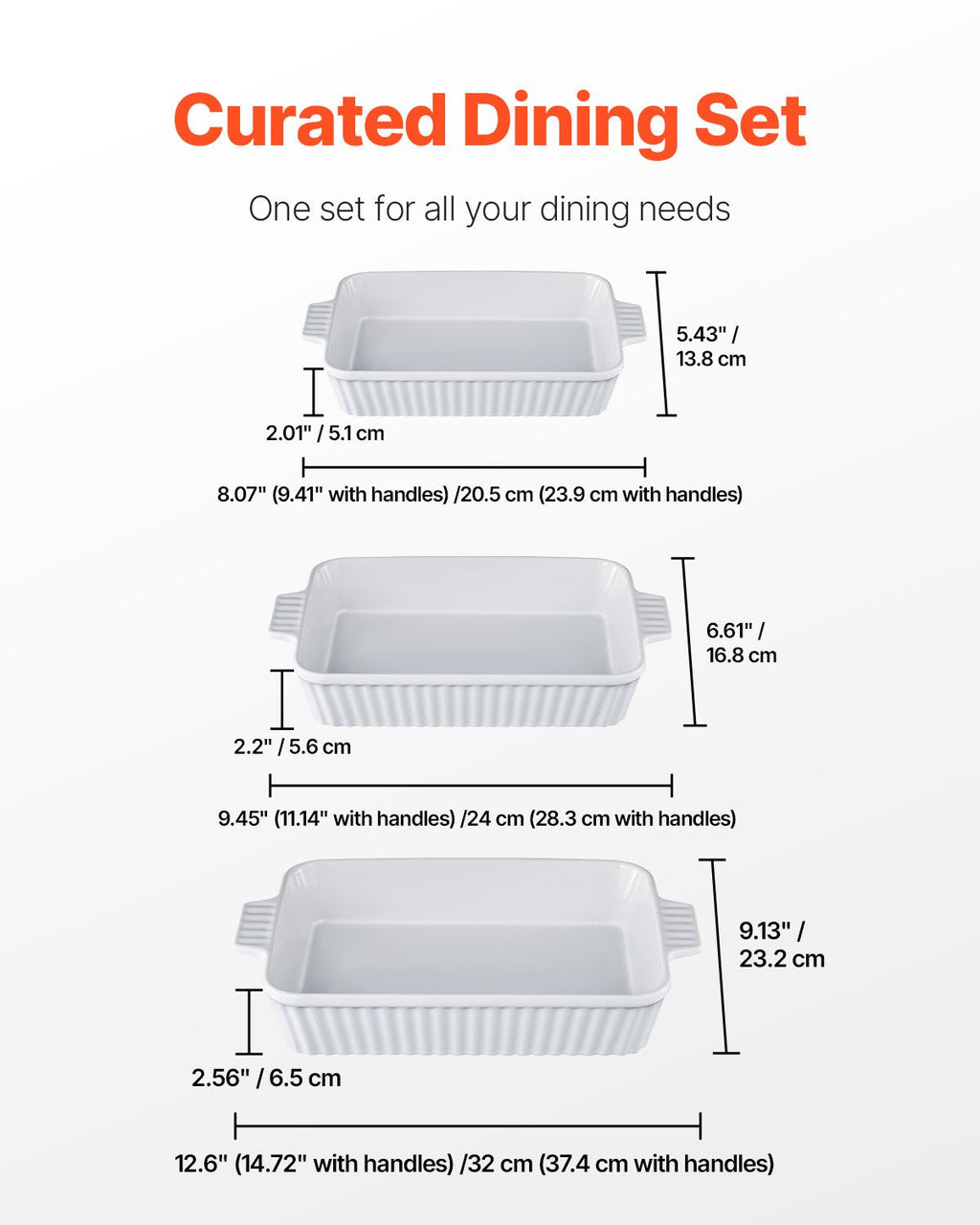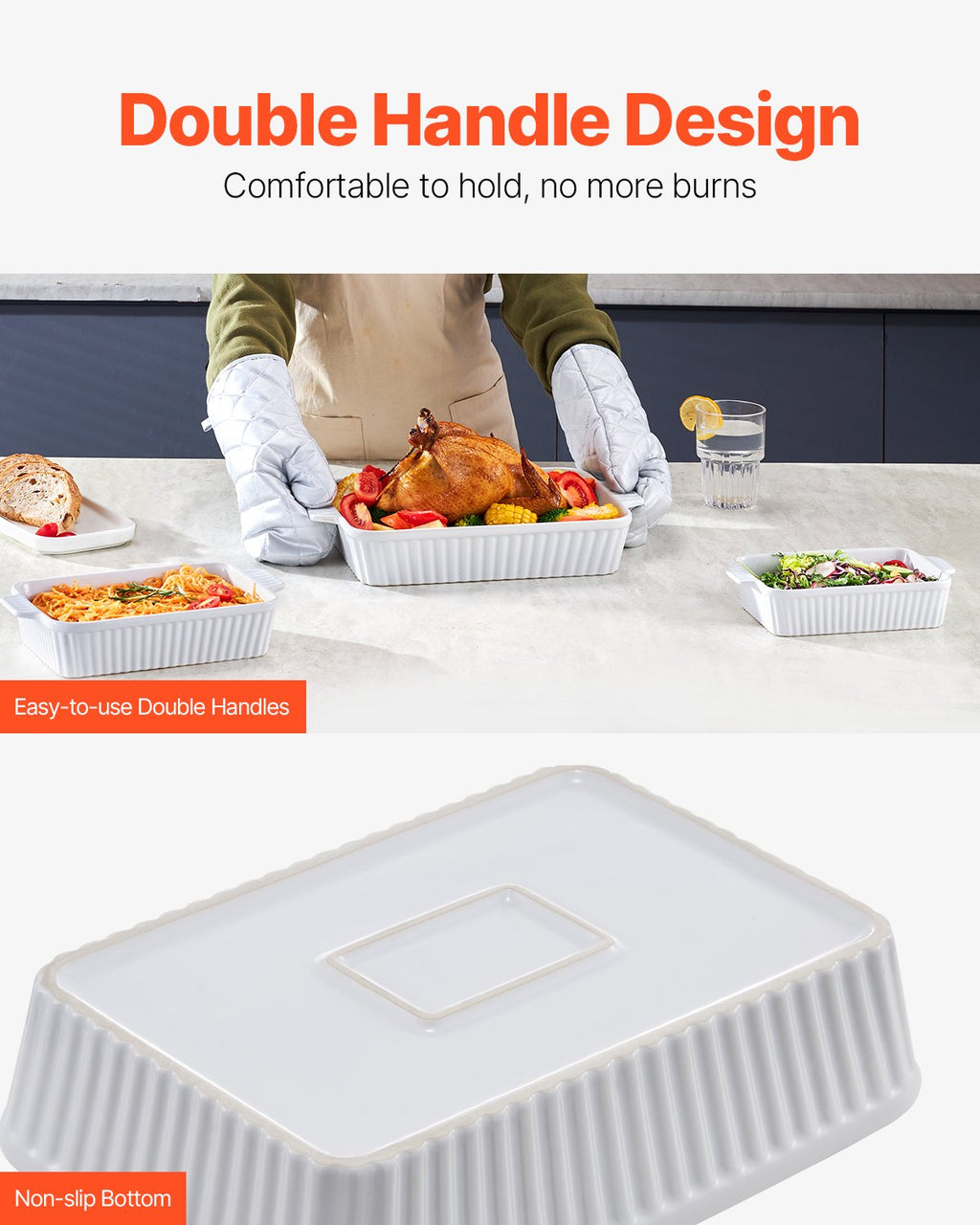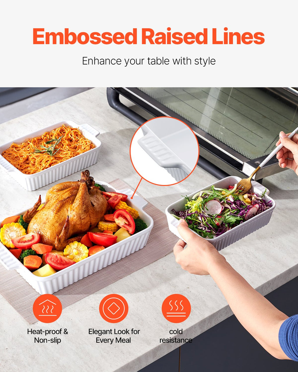 Upgrade your kitchen with the VEVOR Ceramic Baking Dish Set. This 3-piece rectangular bakeware set features high-quality ceramic construction, perfect for all your baking needs. From cakes and casseroles to roasted vegetables, these versatile dishes are designed for both everyday use and special occasions. With their bright white color and elegant design, they are also perfect for serving directly from oven to table.