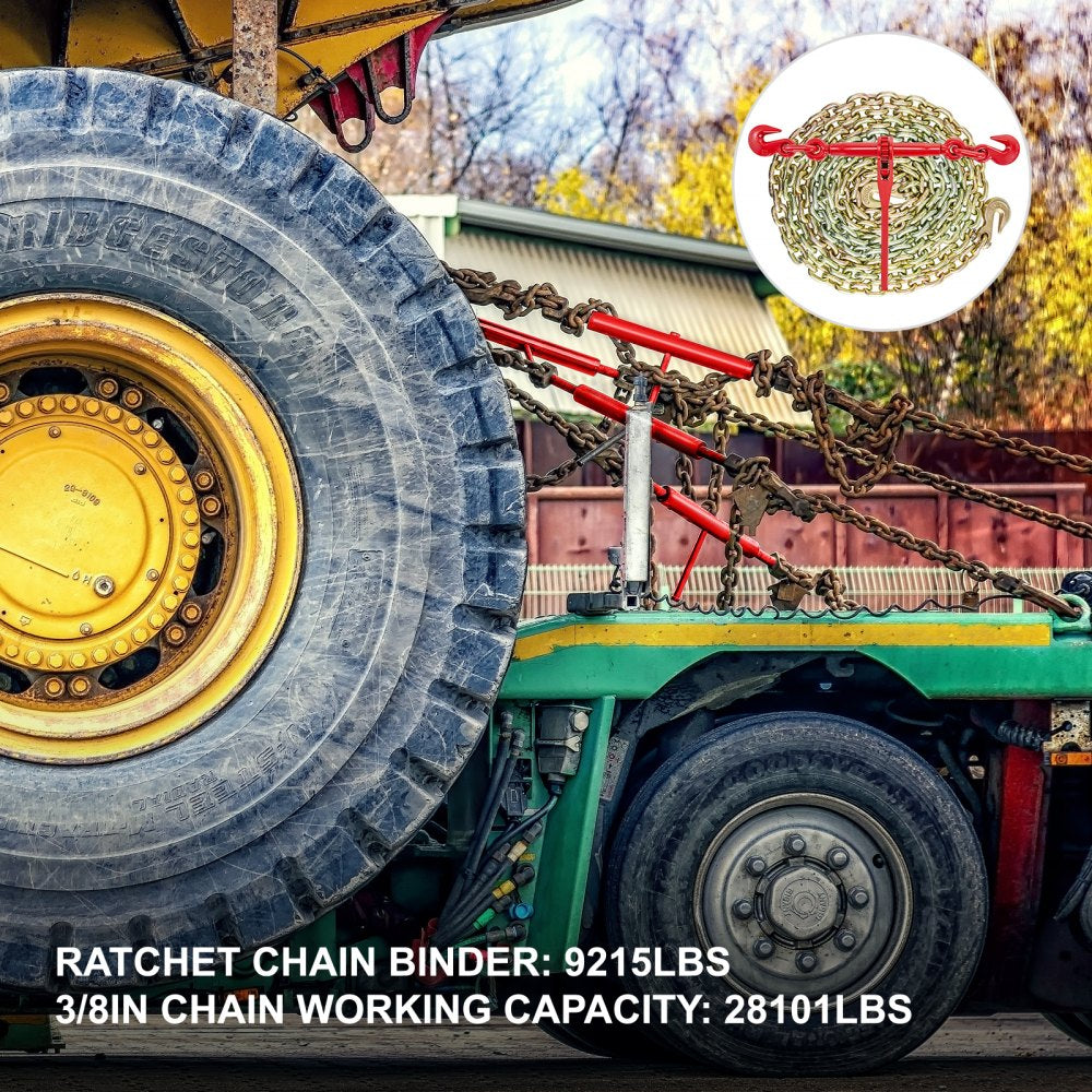 The VEVOR Chain and Binder Kit is a heavy-duty solution for all your hauling, towing, and tie-down needs. With a working strength of 9,215 lbs, this kit includes 3/8" x 10' chains with G70 hooks and ratchet load binders designed for strength and ease of use. Made from durable steel, the binders and chains are built to withstand intense pressure. The adjustable range of the ratchet binders (25" to 32") ensures a perfect fit for a variety of loads, while the 14" handle offers superior control. Perfect for trucks, trailers, and more, this kit is ideal for both professionals and DIY enthusiasts.