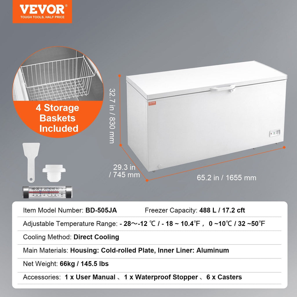 The VEVOR Chest Freezer offers superior storage capacity and functionality for both commercial and home use. With a vast 17.2 cu.ft / 488 L capacity, it provides ample space for your frozen goods. Featuring 4 removable baskets for easy organization, a locking lid for security, and LED lighting for visibility, this freezer is designed for convenience. Its 7-level adjustable temperature range ensures optimal performance for various freezing needs. Perfect for any setting, from kitchens to warehouses, it promises efficient and energy-saving operation.