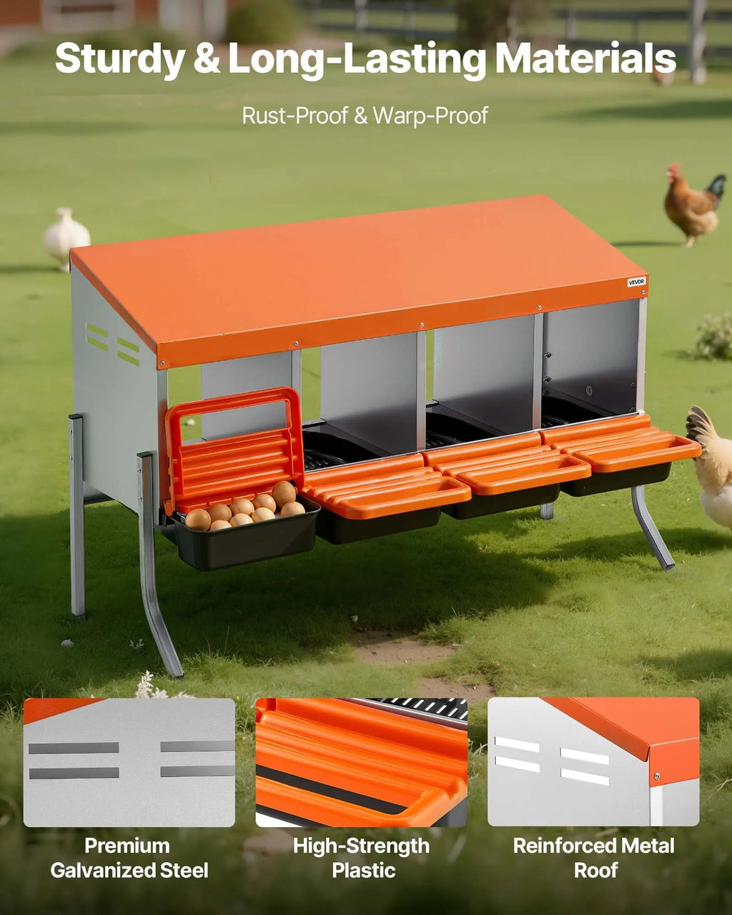 The VEVOR 4-Compartment Chicken Nesting Boxes provide a safe, comfortable, and efficient laying environment for chickens and hens. Designed with angled trays, sturdy materials, and support legs, these roll-away nesting boxes make egg collection easy while promoting higher egg production and maintaining cleanliness. Ideal for backyard poultry, small farms, and hobbyists.
