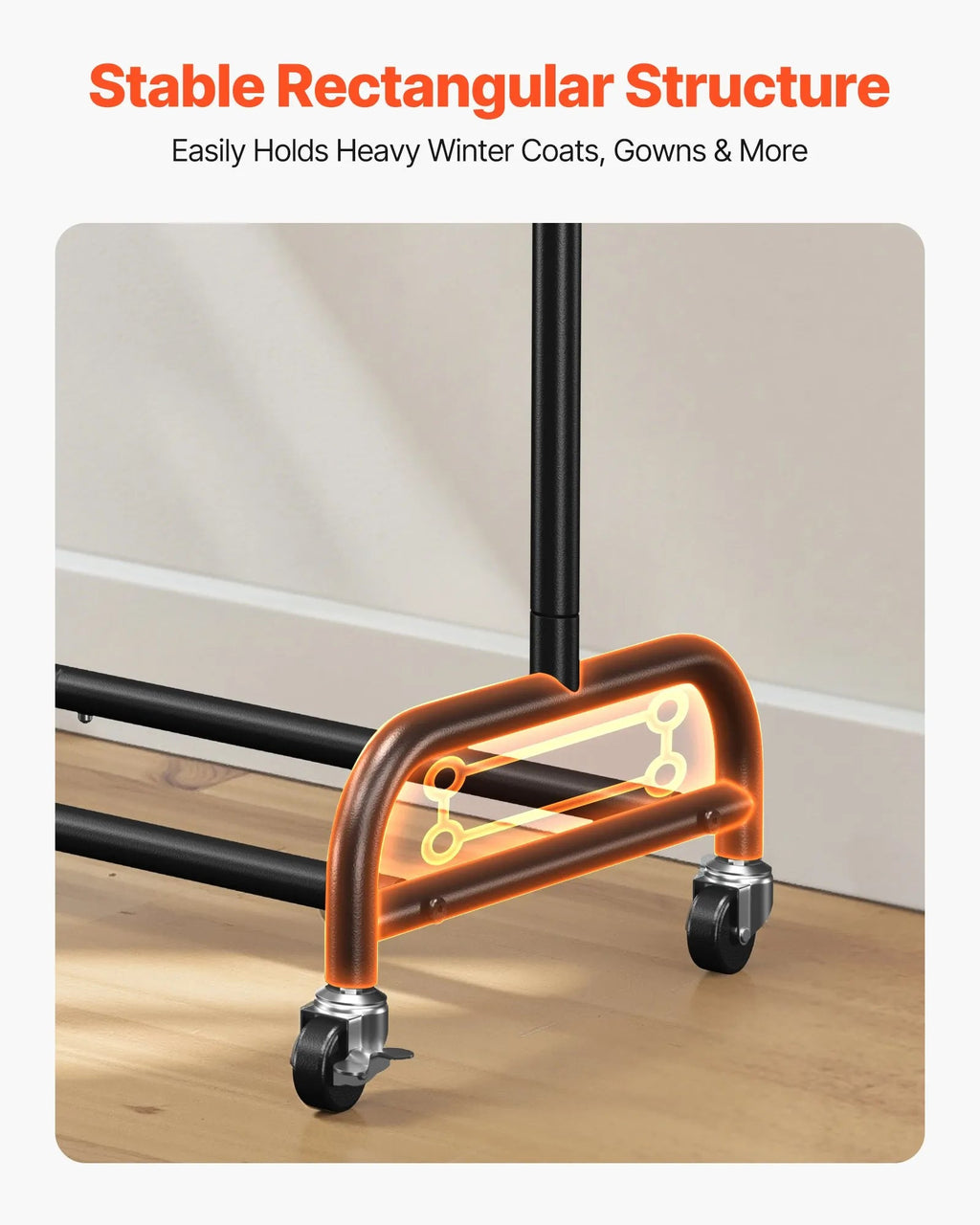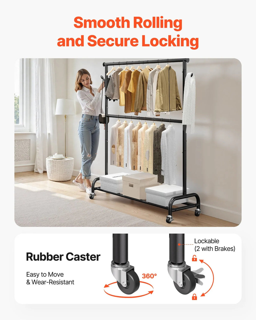 Organize your space with ease using the VEVOR Rolling Clothes Rack. Designed with adjustable hanging rods, side hooks, and smooth-rolling wheels, this heavy-duty garment rack offers ample storage, strong support, and flexible mobility for bedrooms, laundry rooms, living areas, or retail use.