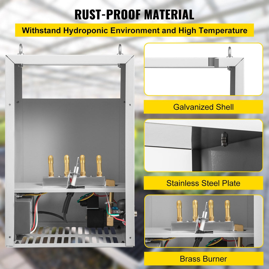 The VEVOR CO2 Burner is a high-performance carbon dioxide generator designed to boost plant growth across a variety of environments. Featuring four durable brass burners, this liquid propane (LP) CO2 generator delivers a powerful 11,178 BTU/hr output for efficient CO2 production. Equipped with built-in electronic ignition, it ensures easy and reliable start-up. Perfect for greenhouses, green tents, hydroponic rooms, and grow rooms, this CO2 burner provides a steady CO2 supply to support healthy, productive plants.