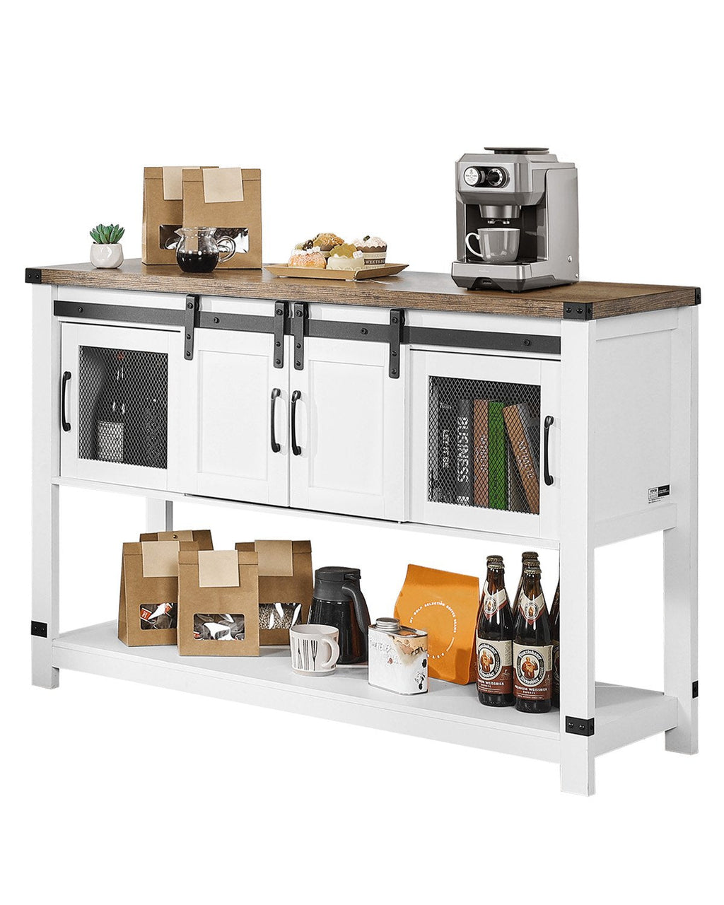 The VEVOR Coffee Bar Cabinet is a perfect blend of style and functionality, featuring a charming farmhouse design that complements any living room or kitchen space. With its four-tier storage and barn doors, this coffee bar table provides ample space for organizing your coffee essentials, while also offering a rustic touch to your home decor. Built with high-quality materials and equipped with an anti-tip device, this piece is both durable and safe, making it ideal for daily use. Whether you're hosting guests or enjoying a cozy morning coffee, this multi-functional storage solution will keep your space neat and stylish.