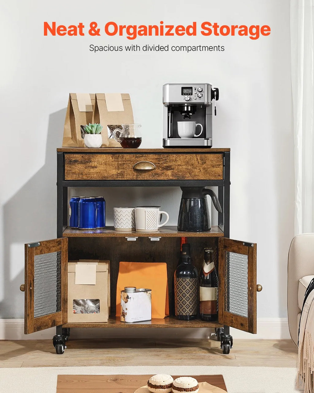 The VEVOR 4-Tier Coffee Bar Cabinet is a stylish and functional storage solution designed to organize your coffee essentials while enhancing your home décor. Featuring a charming farmhouse-style design, this coffee bar table combines durable MDF boards with a sturdy carbon steel frame for long-lasting stability. The four-tier storage layout provides ample space for coffee machines, mugs, jars, and kitchen accessories, while the mesh door cabinet keeps items protected yet visible. Equipped with smooth-rolling wheels for easy mobility, this coffee station can be conveniently moved around your kitchen, dining room, or living space. With its strong structure and anti-tip safety design, this cabinet delivers both practicality and style for everyday use.