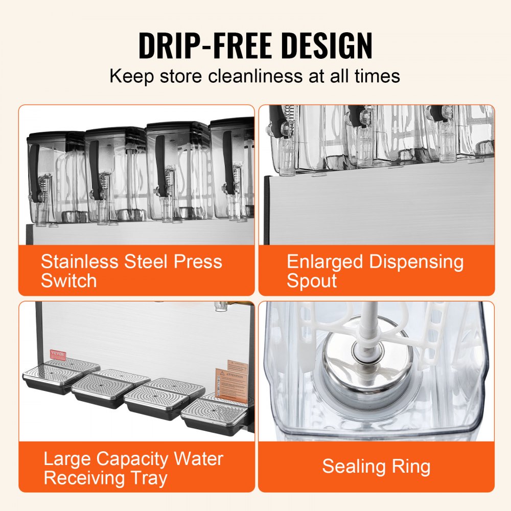 The VEVOR Commercial Beverage Dispenser offers a large capacity with four 12L tanks, designed to hold and dispense cold beverages with ease. Perfect for commercial use, it features efficient temperature control, ensuring your drinks stay refreshingly cold. Made from food-grade materials, this dispenser is durable and safe for use with juices, ice drinks, and other beverages. The user-friendly design allows for easy operation, while its stylish exterior fits seamlessly into any setting. Whether for restaurants, cafes, or events, this beverage dispenser is the ideal solution for keeping drinks cold and easily accessible.