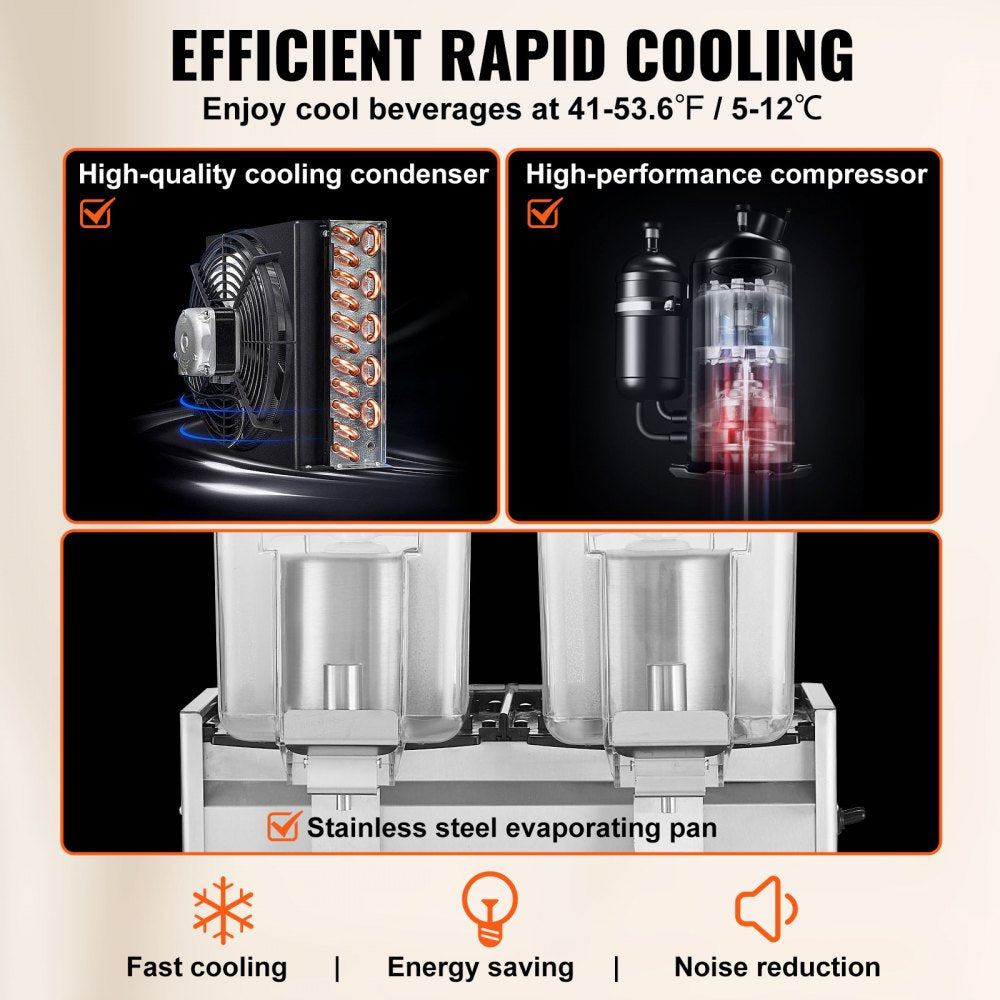 Serve refreshing cold beverages with ease using the VEVOR Commercial Beverage Dispenser. Featuring three large 13.6-quart (12L) tanks, this heavy-duty dispenser is perfect for restaurants, hotels, parties, and any commercial setting. Built with durable 304 stainless steel food-grade materials, it ensures safe and long-lasting use. The powerful 620W cooling system keeps drinks chilled efficiently between 41°F and 53.6°F (5°C - 12°C), while the adjustable thermostat lets you maintain the perfect temperature. Thoughtfully designed with convenience in mind, this dispenser includes easy-to-use faucets and additional accessories to enhance your serving experience.