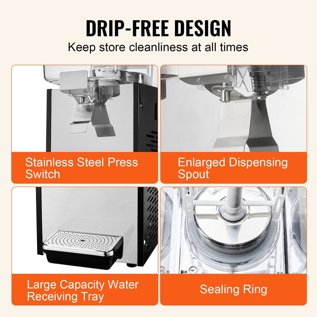 The VEVOR Commercial Beverage Dispenser with an 18L capacity is the perfect solution for serving chilled drinks at parties, events, or in commercial settings. Featuring a powerful 300W cooling system, this dispenser maintains optimal drink temperatures for extended periods. Constructed from food-grade materials, it ensures safe and hygienic usage. Its intuitive design includes an easy-pour spout, clear tank visibility, and easy cleanup features, making it user-friendly and efficient. Stylish and compact, this dispenser is ideal for any professional or festive environment.
