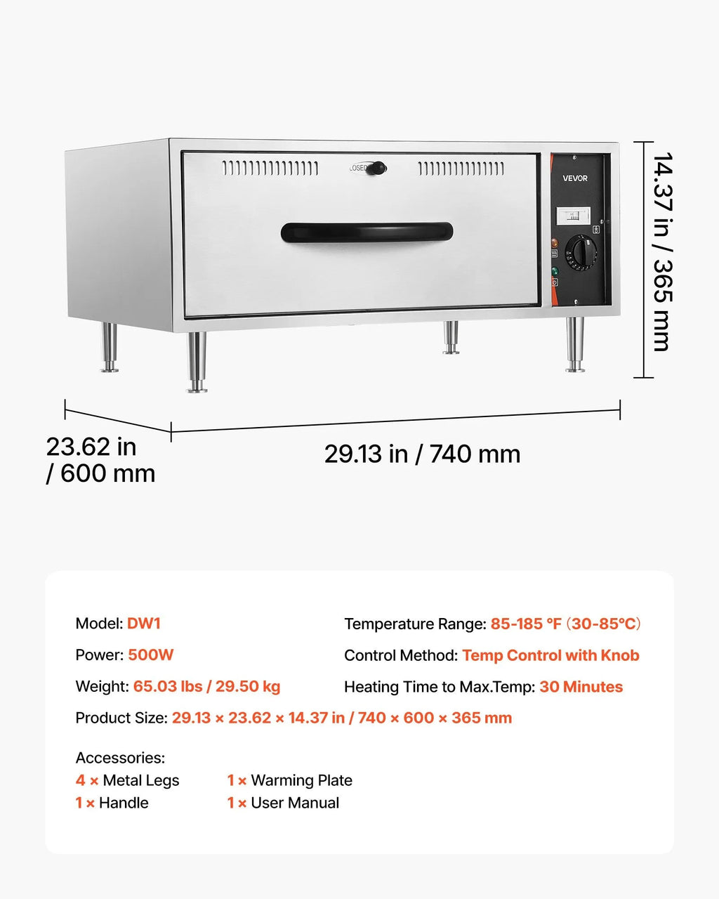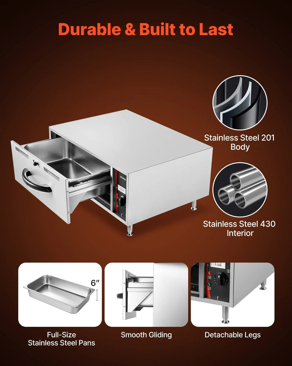 Keep your food warm and ready to serve with the VEVOR Commercial Electric Drawer Warmer. Featuring a single stainless steel drawer with precise temperature and humidity control, this freestanding warming cabinet is ideal for restaurants, hotels, bakeries, and catering events.