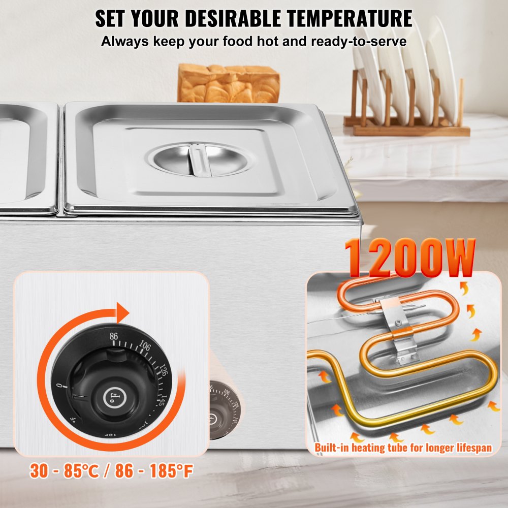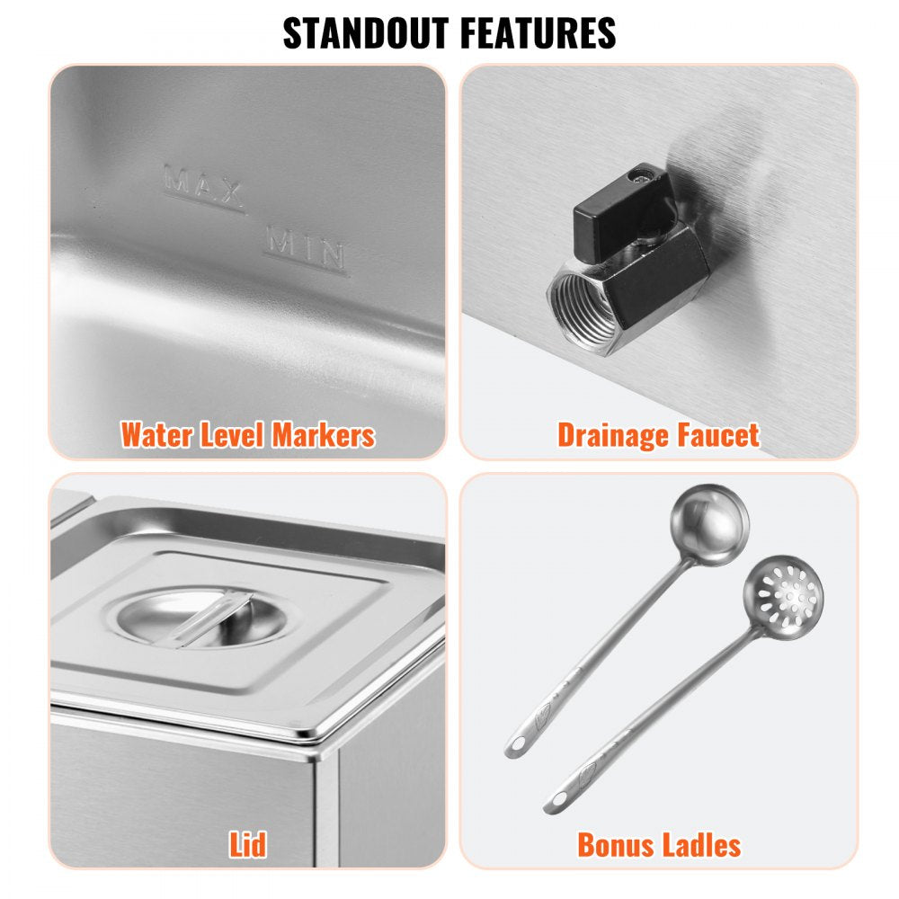 The VEVOR Commercial Electric Food Warmer is the ideal solution for keeping food warm and ready to serve in any commercial setting. With a generous 18QT capacity and two pans, this Bain Marie-style food warmer features adjustable temperature controls, dry-burn protection, and stainless steel construction for durability. It’s perfect for buffets, catering, or restaurant use and ensures your food stays at the perfect serving temperature throughout service.