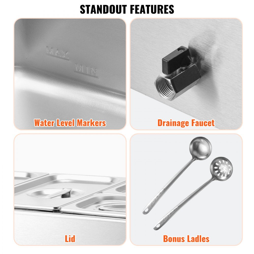 The VEVOR Commercial Electric Food Warmer is a reliable and efficient solution for keeping food warm and ready to serve in any commercial or catering setting. With four included pans and a total capacity of 16.4 quarts, this countertop buffet-style bain marie is ideal for restaurants, food trucks, and self-service stations. The adjustable temperature control ranges from 86°F to 185°F, allowing precise heat regulation for a variety of dishes. Its stainless steel construction ensures durability, hygiene, and easy cleaning. Equipped with a dry-burn protection system, this unit offers added safety during operation.
