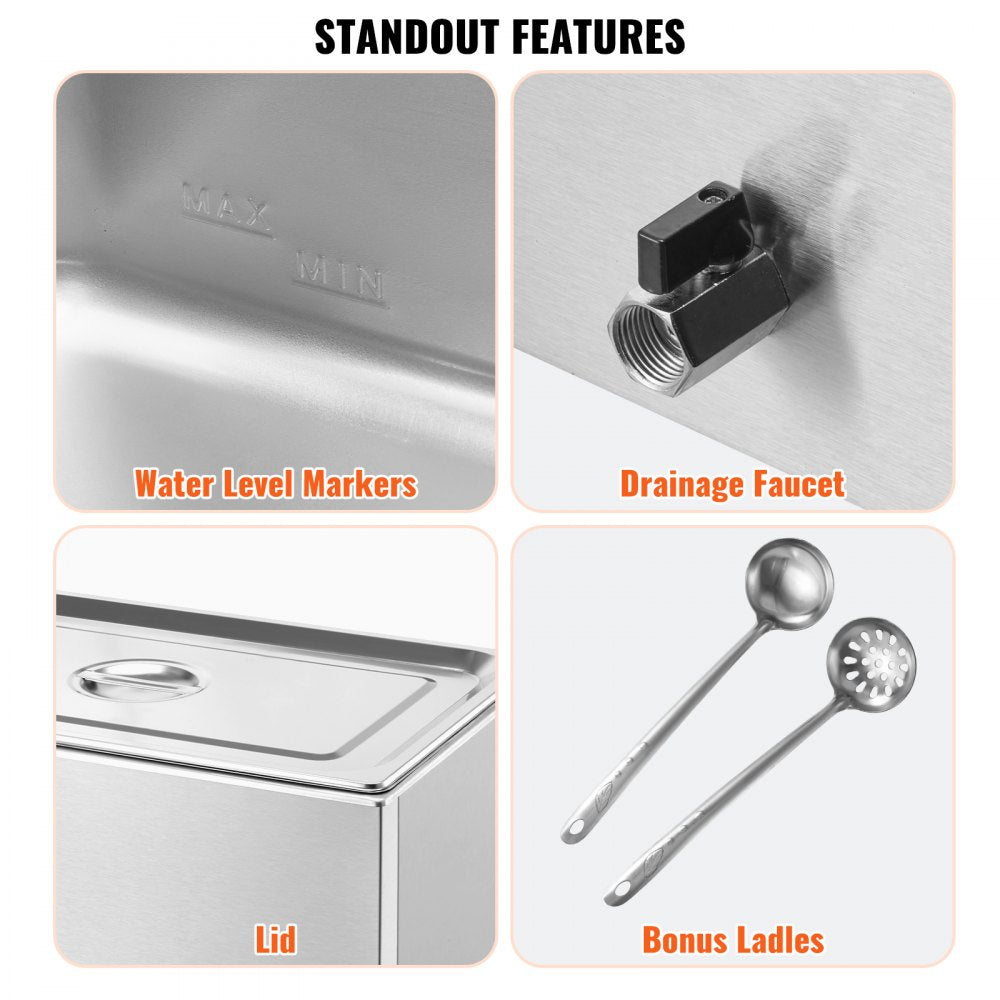 Keep your food hot and ready to serve with the VEVOR Commercial Electric Food Warmer, ideal for buffets, catering services, and self-serve stations. This countertop bain-marie unit features a 19-quart stainless steel pan, adjustable temperature controls, and a dry-burn protection system to ensure safety and consistent heat. Durable and compact, it’s perfect for restaurants, cafeterias, concession stands, and home gatherings alike.