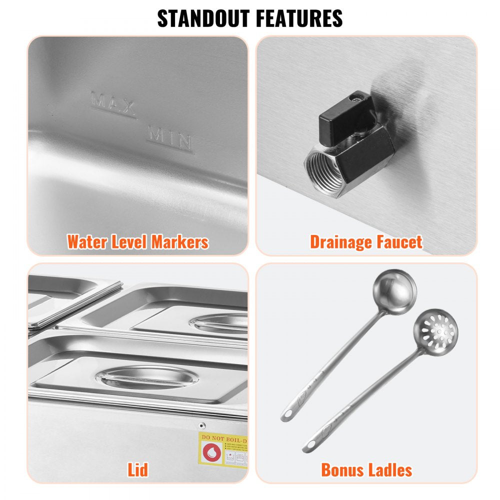 The VEVOR Commercial Electric Food Warmer is an essential addition to any buffet, catering event, or restaurant. This countertop bain-marie comes with four 8QT pans, offering ample space for holding a variety of dishes. The unit features an adjustable temperature range of 86-185°F (30-85°C) and a 1500W heating system, providing consistent heat for long-lasting food preservation. With a dry-burn protection system for safety, this unit ensures peace of mind during operation. Constructed from durable stainless steel, it’s designed for easy cleaning and long-term commercial use.