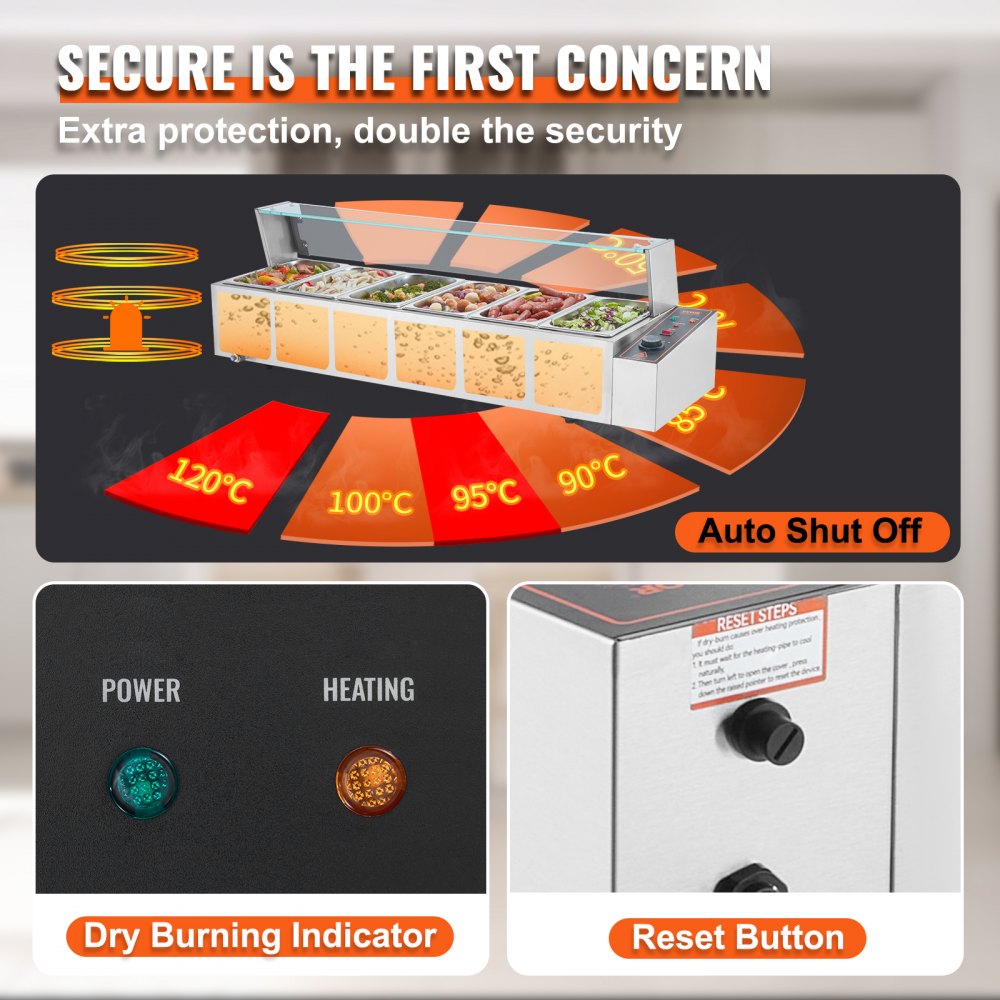 Keep your dishes hot and ready to serve with the VEVOR Commercial Electric Food Warmer, designed for countertop buffet service in restaurants, catering setups, and events. This 6×5QT food warmer features a sleek stainless steel body and a clear glass shield for enhanced food visibility and hygiene. With an adjustable temperature range of 86–185°F, you can precisely control the heat to maintain ideal serving conditions. The dry-burn protection system ensures safe, long-lasting use, making it a reliable solution for busy commercial kitchens.
