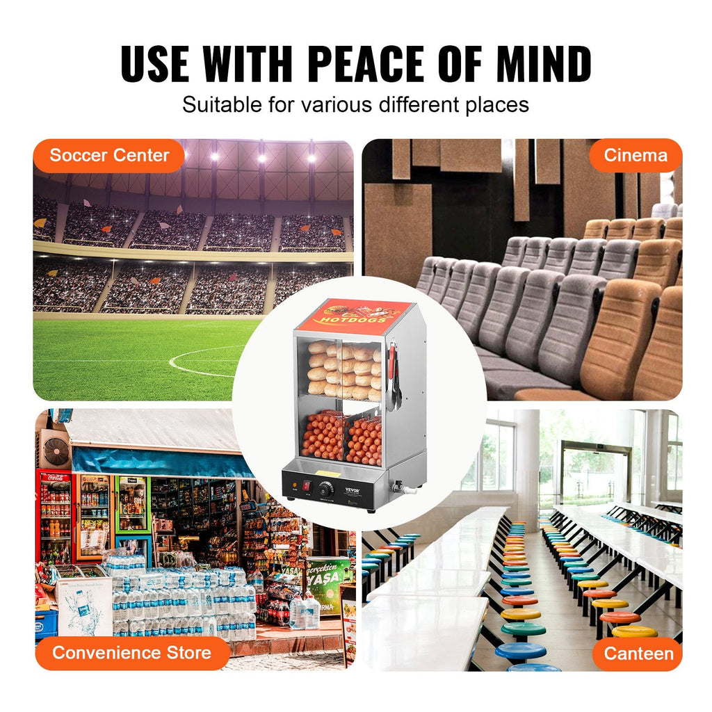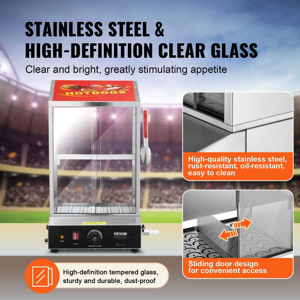 Serve hot dogs and buns at the perfect temperature with the VEVOR Commercial Hot Dog Steamer and 2-Tier Electric Bun Warmer. Featuring a 39QT (37L) capacity and efficient steam heating, this versatile unit keeps your food hot and fresh while being easy to access. The 2-tier design maximizes space, while the slide doors and temperature control knob offer simple operation and convenience. Whether you’re running a snack bar, concession stand, or catering event, this commercial food steamer ensures your hot dogs and buns are ready to serve quickly and safely.