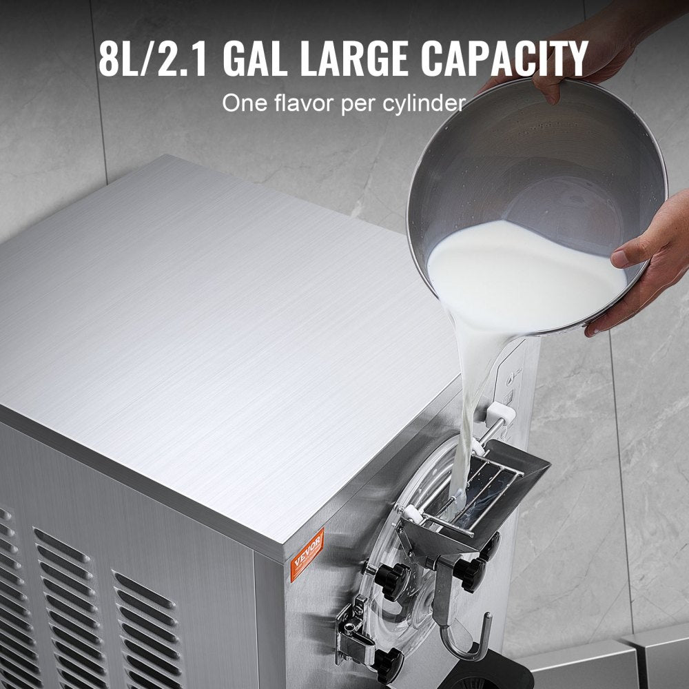 The VEVOR Commercial Ice Cream Machine is a high-performance, freestanding machine designed for creating hard-serve ice cream at commercial levels. With a yield of 20-25L per hour, this 2400W machine is perfect for restaurants, snack bars, and other food service operations. It features an 8L stainless steel cylinder, an optimized cooling system, and a digital display for easy operation. The auto-clean function ensures convenience, while the adjustable hardness control allows you to customize the consistency of your ice cream. Designed for durability and efficiency, this machine ensures high-quality ice cream production, day in and day out.