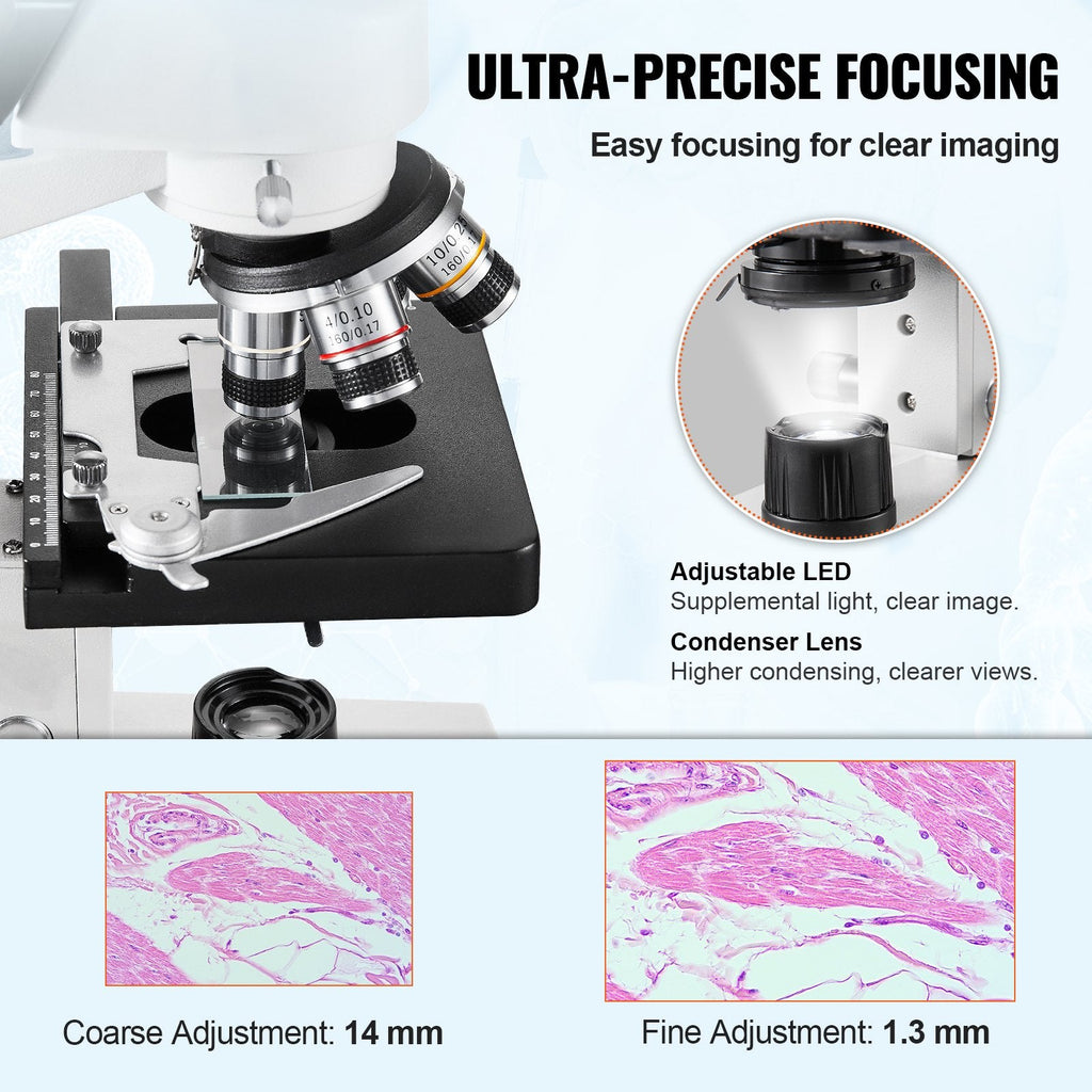 Explore the microscopic world with clarity and precision using the VEVOR Compound Trinocular Microscope, offering an impressive 40X to 5000X magnification. Designed for advanced users, students, and professionals, this lab-grade microscope features a dual focusing system, bright LED illumination, and a trinocular port for connecting to an external screen or camera. With a durable metal double-layer stage and an extensive accessory kit, it’s ideal for biological, educational, and clinical applications.