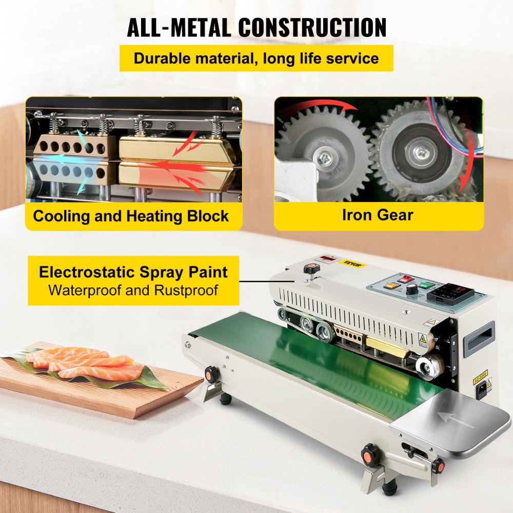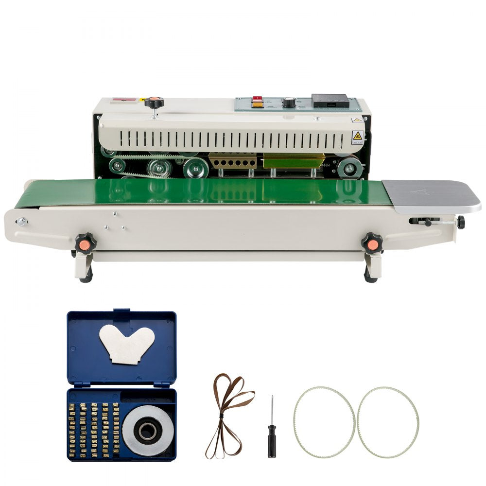 Achieve excellent sealing performance with the VEVOR FR900K Continuous Bag Band Sealing Machine. Designed for fast and efficient horizontal sealing of plastic bags with thicknesses ranging from 0.02 to 0.08 mm, this band sealer features precise digital temperature control for consistent results. Its sturdy steel wheel printing mechanism allows for on-the-fly batch numbering or date printing, adding functionality for packaging and labeling needs. With solid construction and an automatic, portable design, the FR900K offers adjustable sealing speed and temperature to fit a wide range of industrial and commercial packaging applications.